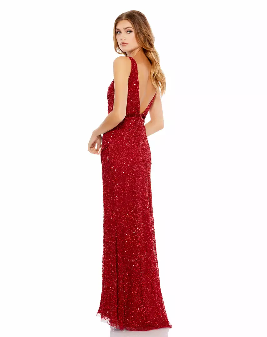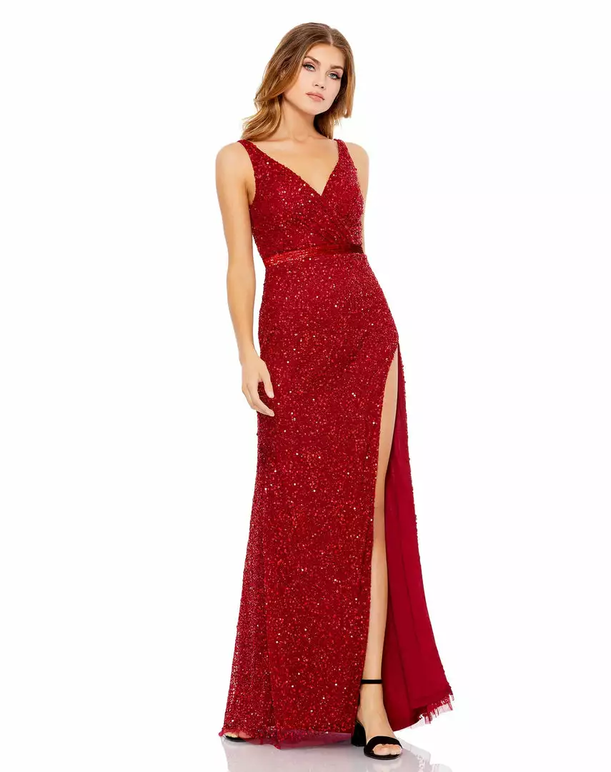 A sundry of sequins add shine and texture to a timeless gown you’ll wear to prom, weddings and so much more. Feel like you walked right off the red carpet in the stunning gown styled with a surplice neckline, embellished belt detail, and leg-baring slit. A plunging back is the icing on an already glamorous cake.