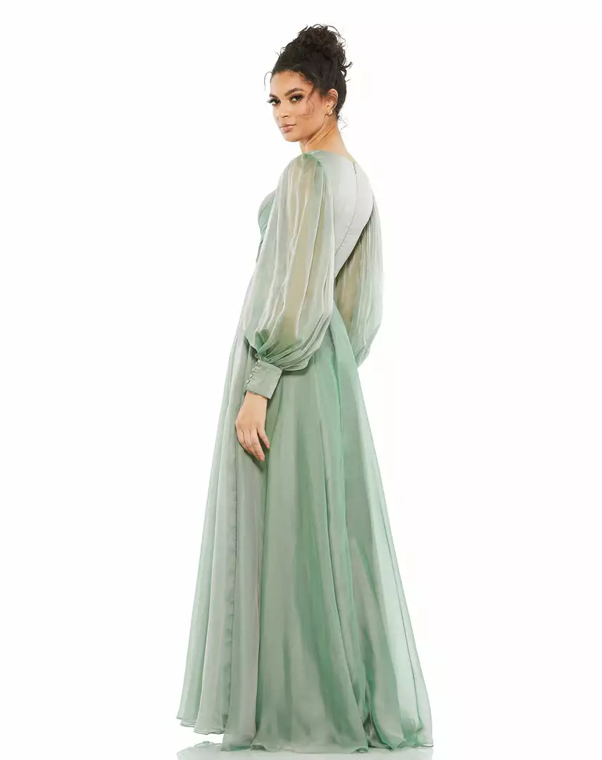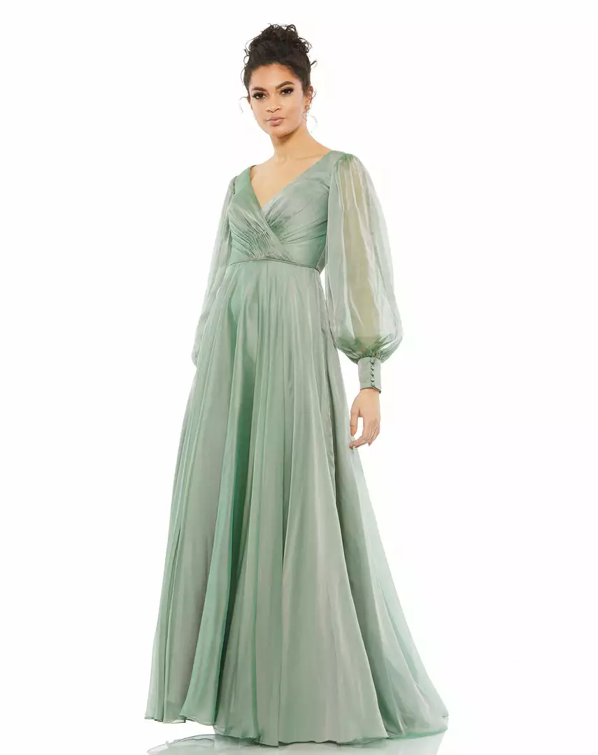 Flowing gown with sheer blouson sleeves, a pleated faux-wrap bodice, v-neckline, and a floor-length chiffon skirt with a sweeping train.