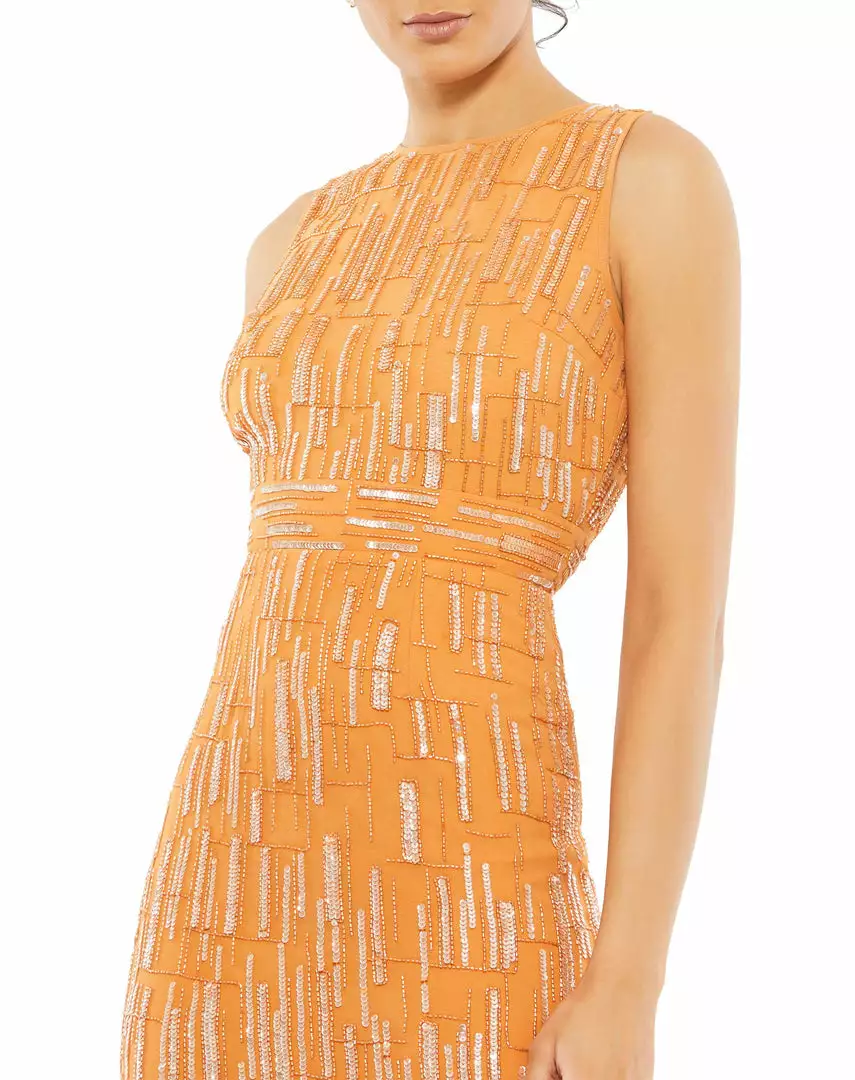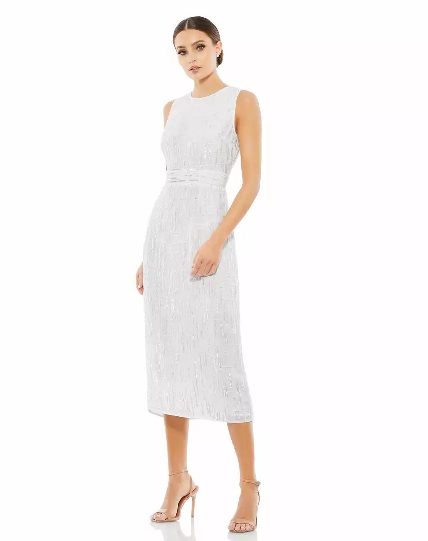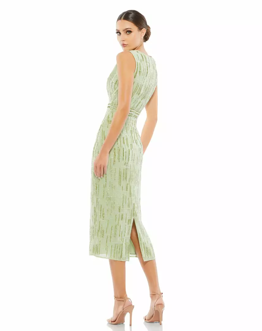 Chic sleeveless midi dress embellished with stripe-patterned sequins and beading.