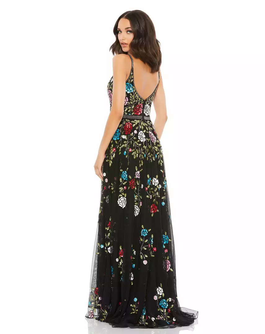 Leaves and stained glass-inspired roses made from sparkling sequins make this gown come to life. Cut from floaty mesh in an A-line silhouette, the dress is fashioned with a V-neckline, barely-there straps, and a beaded waist for a feminine, modern look. Add heels and a chain-strap bag to enter a black-tie wedding with a bang.