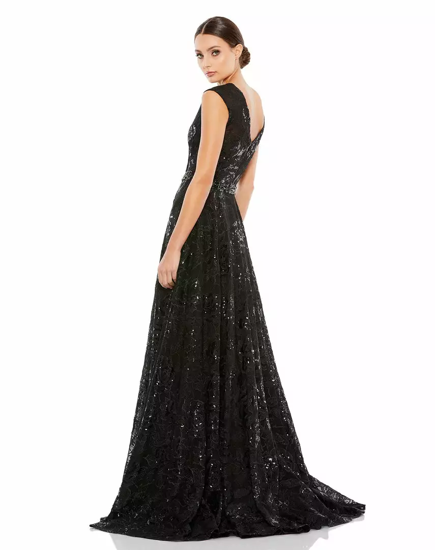 Black sequin evening gown with a v-neck and beautiful sequin detail.