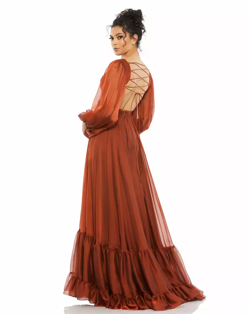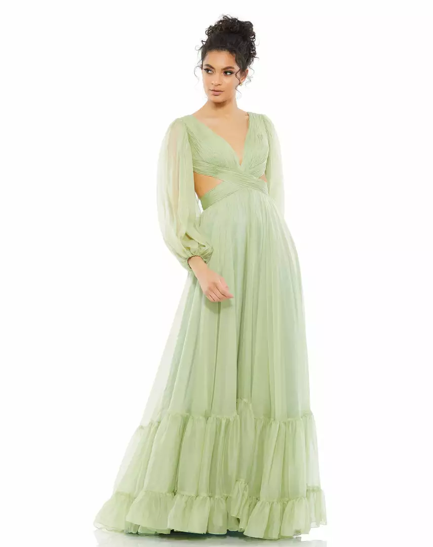 This ethereal maxi dress features a pleated bodice with a plunging v-neckline, sexy side cut-outs, and an exposed lace-up back. Sheer blouson sleeves are complimented by a flowy tiered floor-length skirt.