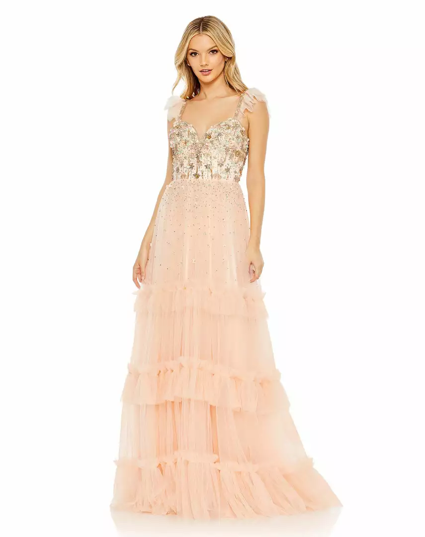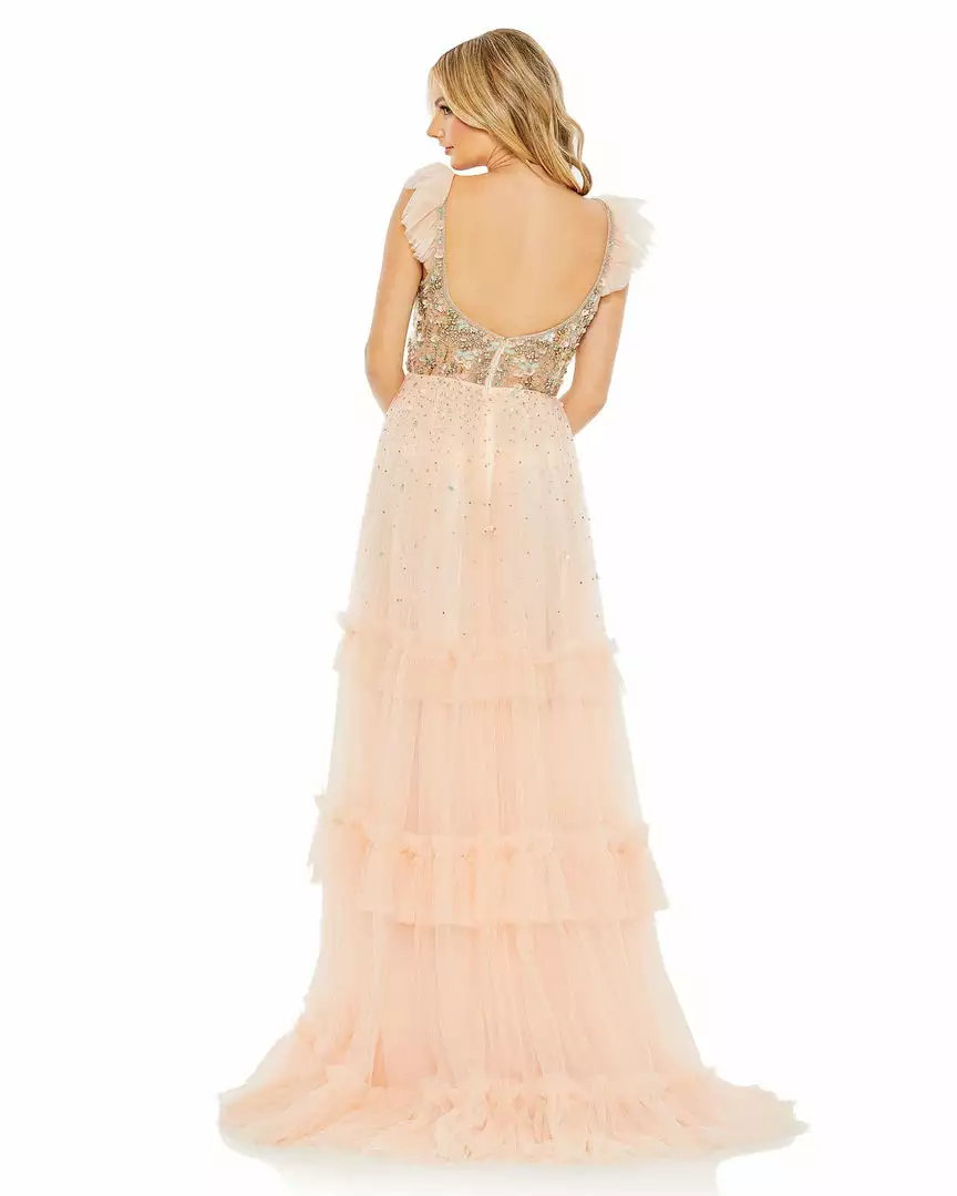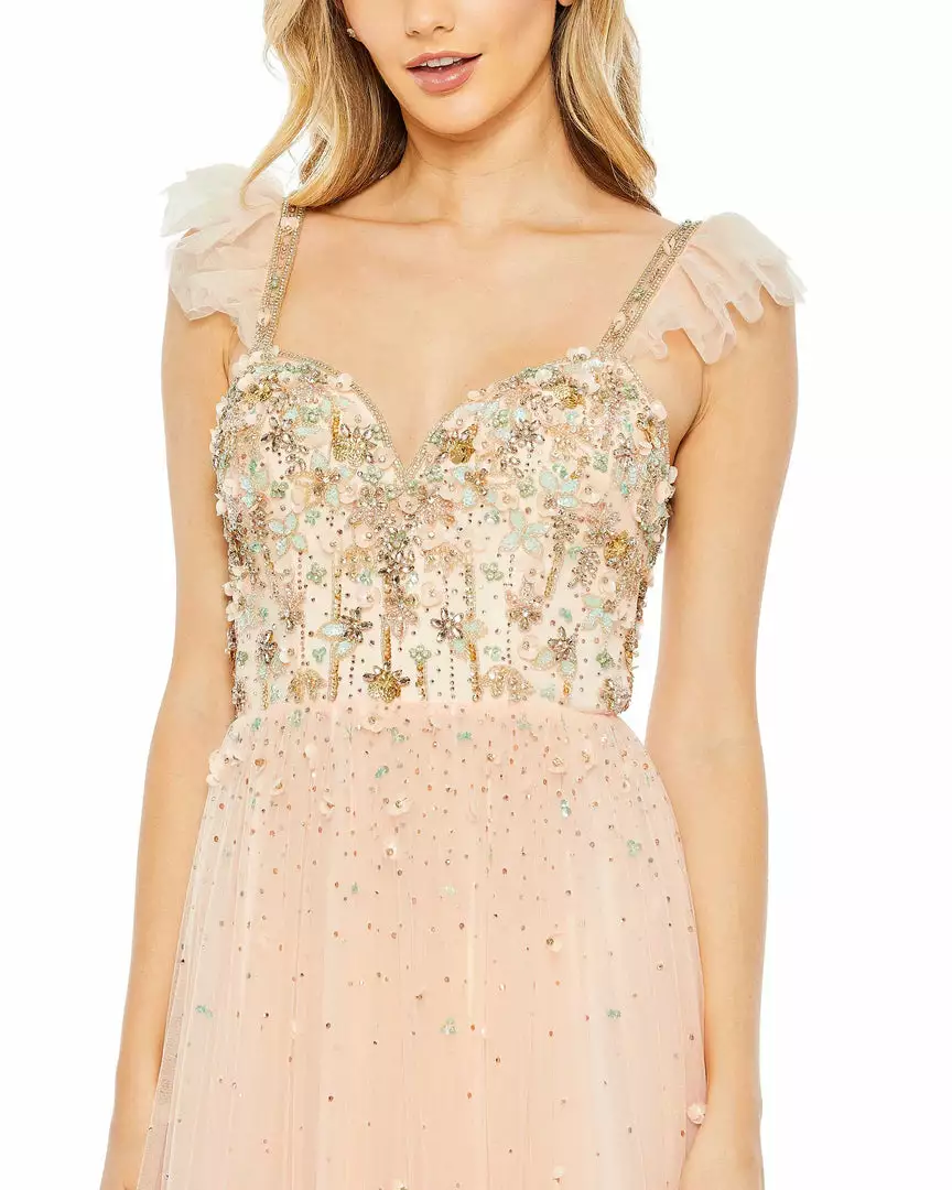 - Beaded ruffle cap sleeves
