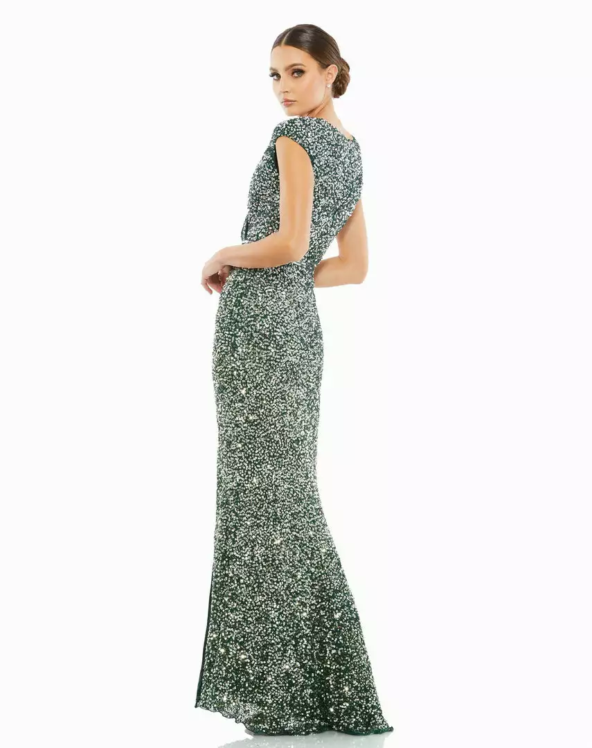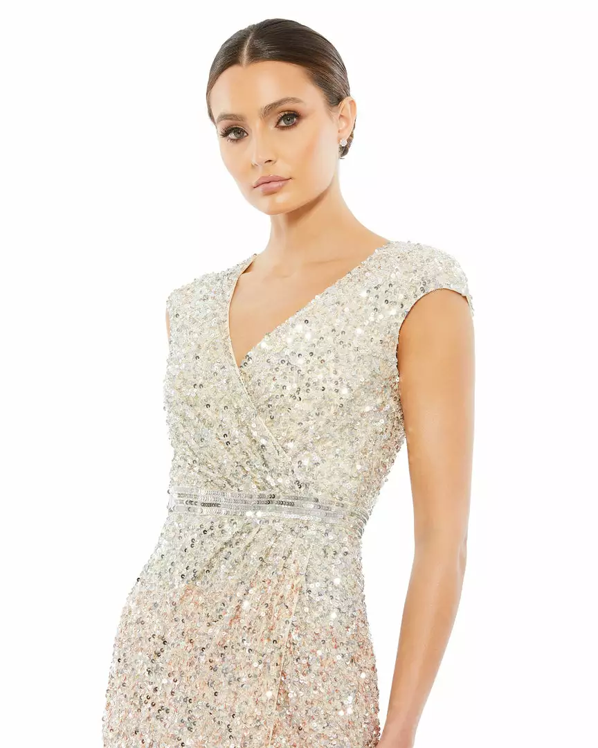 A show-stopping sequin gown belongs in every closet — and we’re partial to this magnificent ombré option. Covered from top to bottom in metallic sequins, this dress shines in so many ways. It’s designed with a V-neckline, cap sleeves, waist-whittling “belt” detail, and a thigh-high off-center slit.