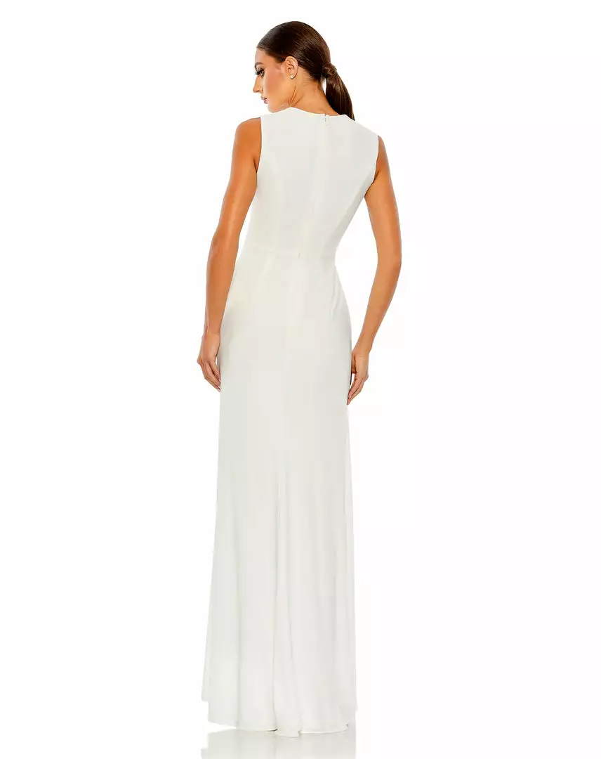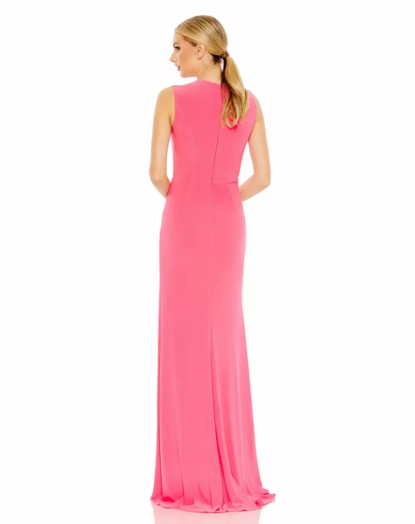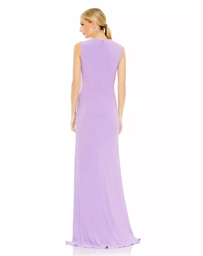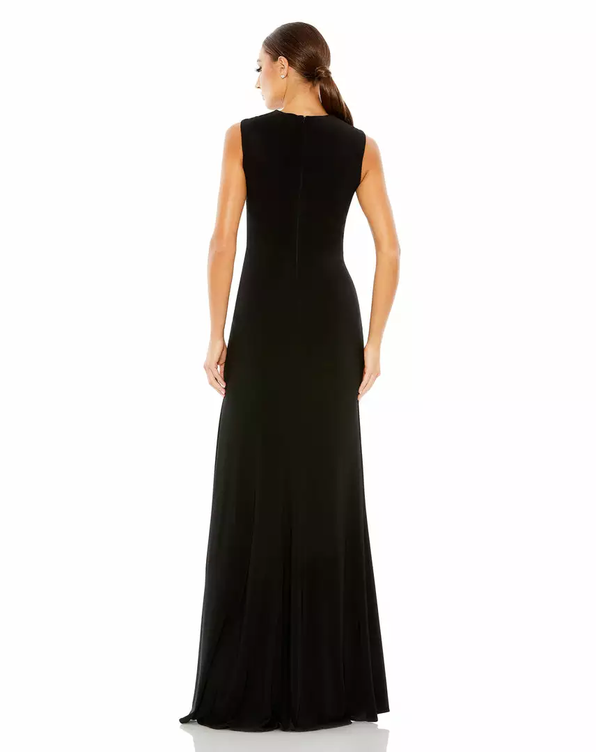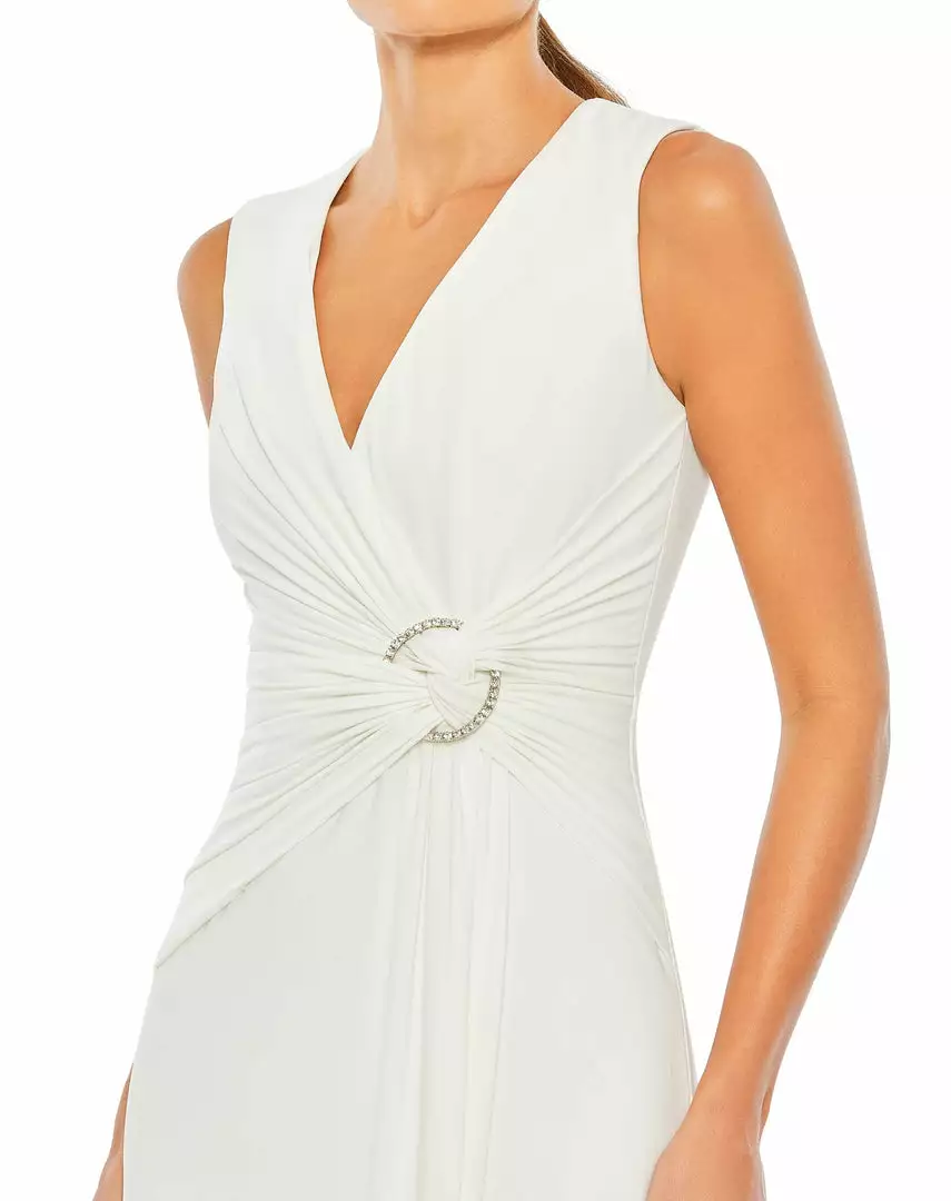 Comfortable. Elegant. Glamorous. This sleek jersey gown is everything to us. Designed with a wrap-style bodice, the dress is fashioned with texture-enhancing gathers that surround a waist twist and round, rhinestone buckle. The dress has a sexy leg slit that creates easy movement and a simple, clean-lined back finished with a concealed zip closure.