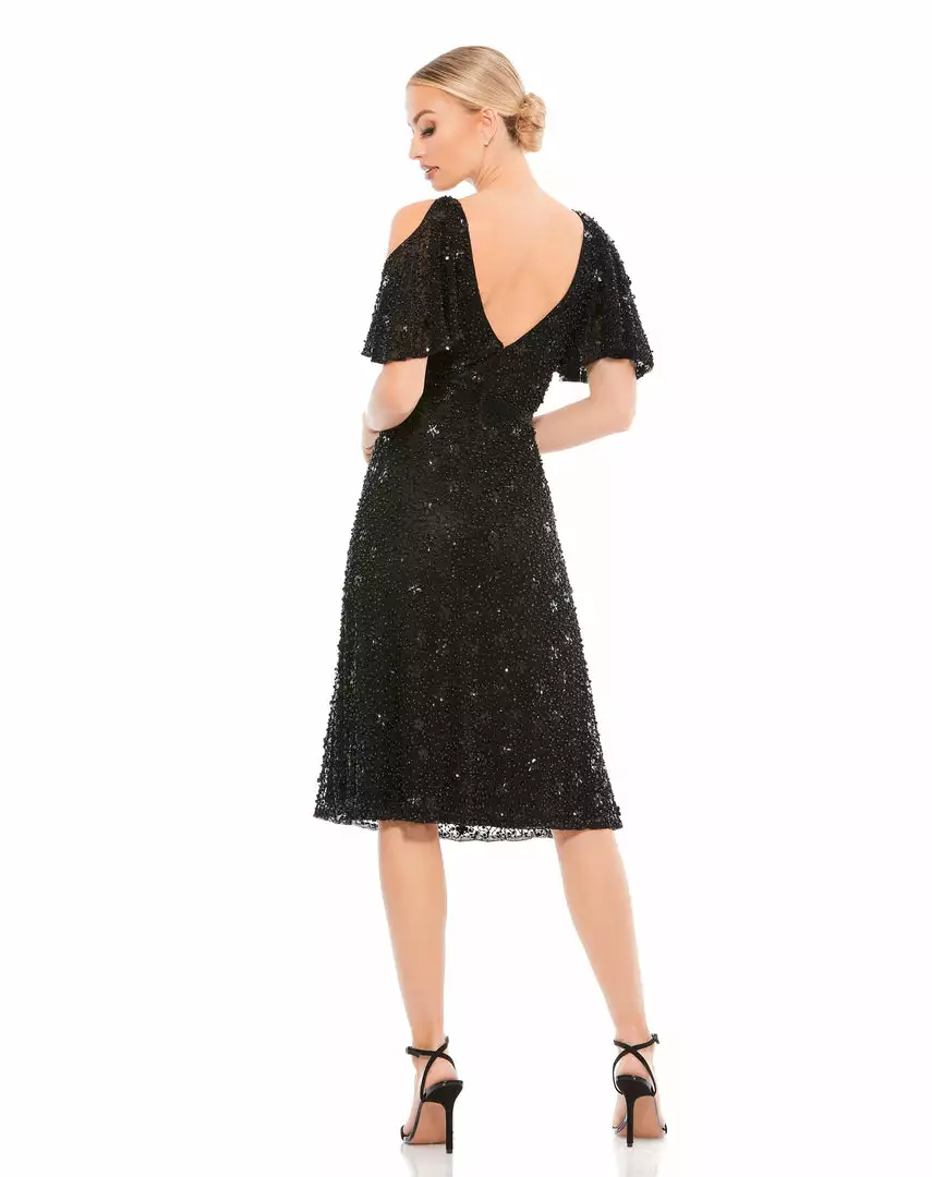 Fully beaded cocktail dress with tonal floral accents, flowy bell sleeves, shoulder cut outs, and a hand-beaded belt.