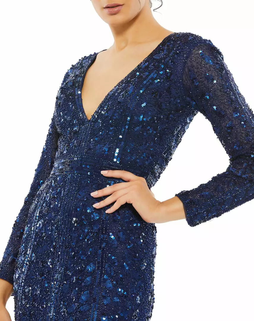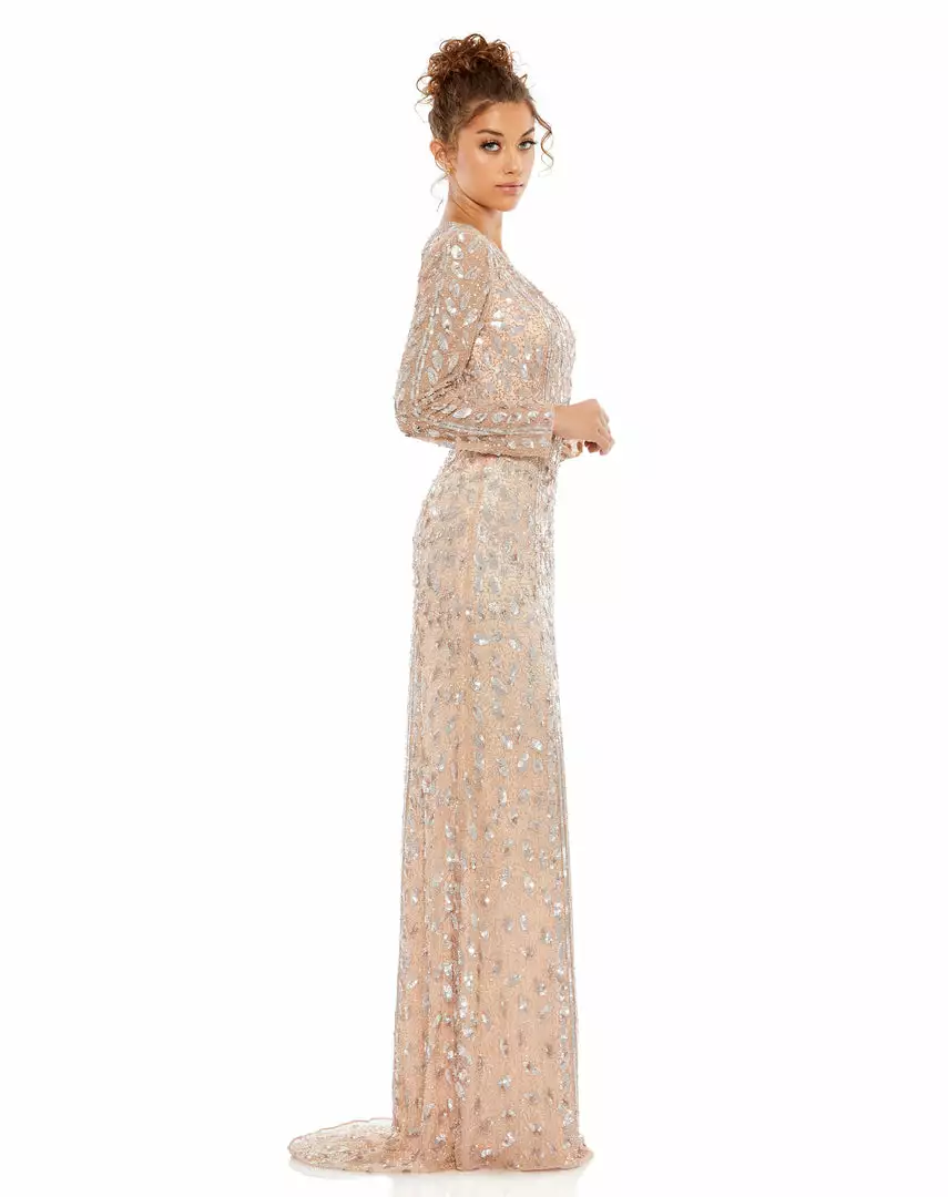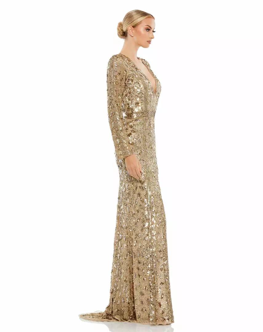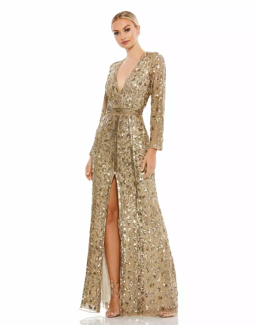 Fully embellished evening gown cut with a dramatic plunge neckline, thigh-high front slit, and a sequined belt at the natural waist. The gown’s mesh overlay and semi-sheer long sleeves are covered in stunning hand-sewn embellishments.