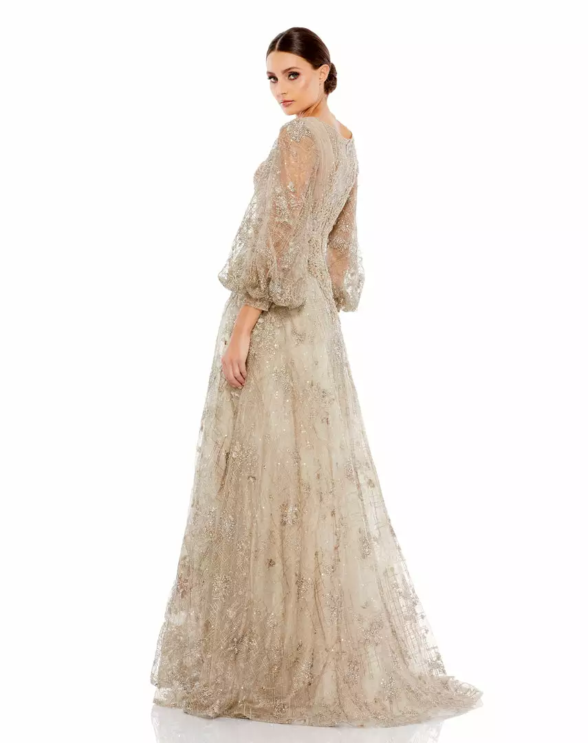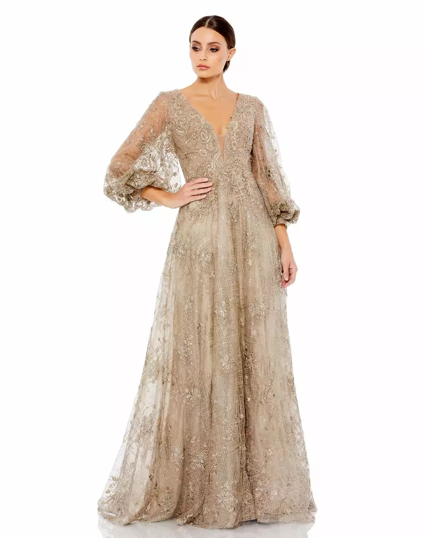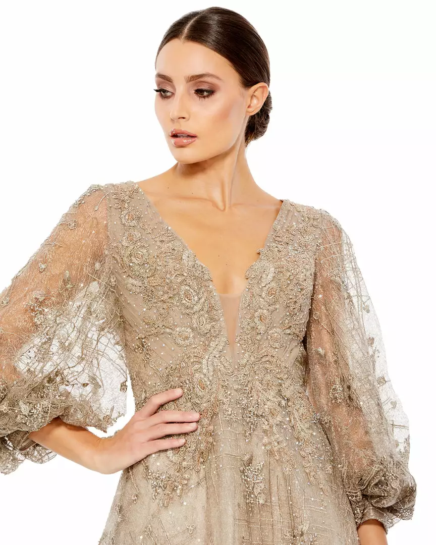 Mac Duggal Shop For Embellished Plunge Neck Puff Sleeve A-Line Gown
