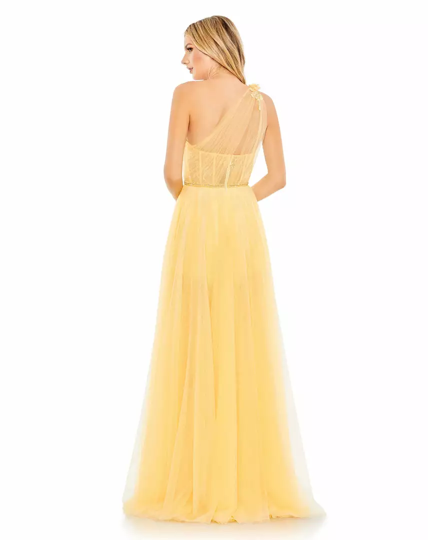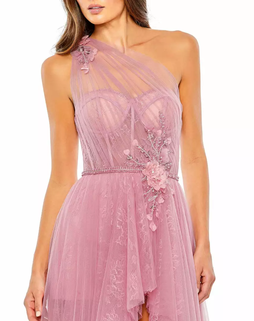 Make an entrance in a gown that rivals every other. This head-turning lace-and-tulle confection is the definition of perfection with a feminine silhouette and no shortage of romantic, luxe detail. Styled with a sheer neck and single shoulder, the dress reveals a corset-style bodice with contoured cups and boning, an attached beaded belt, and up-to-there slit. 3-D petals and glittering stem detail add beautiful touches to the waist and shoulder.