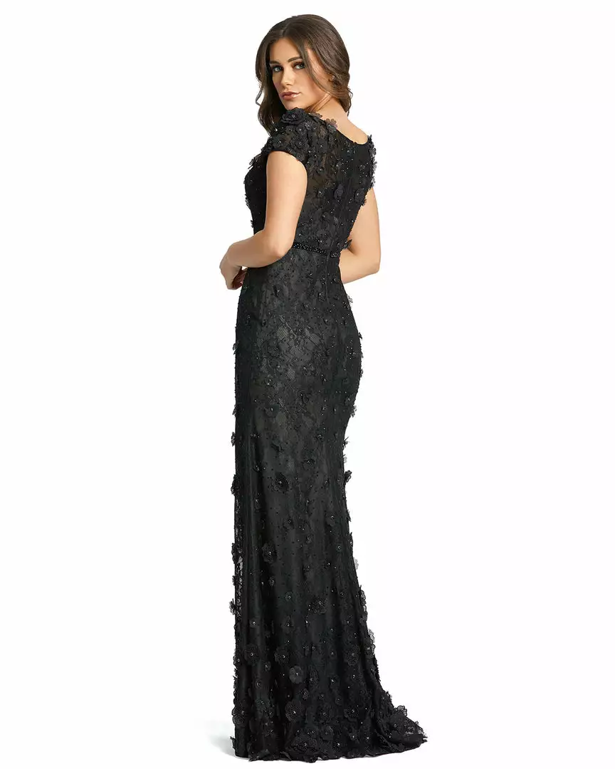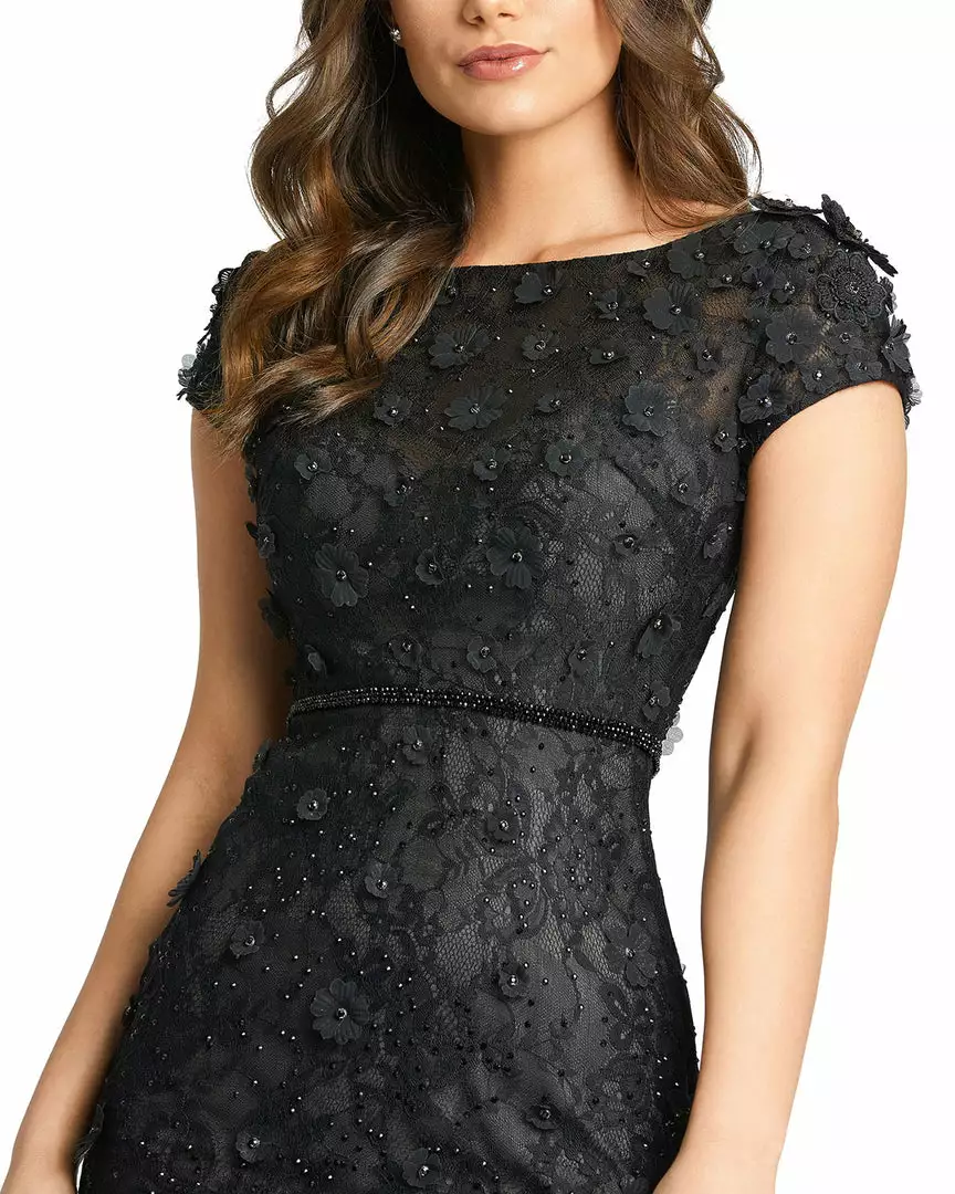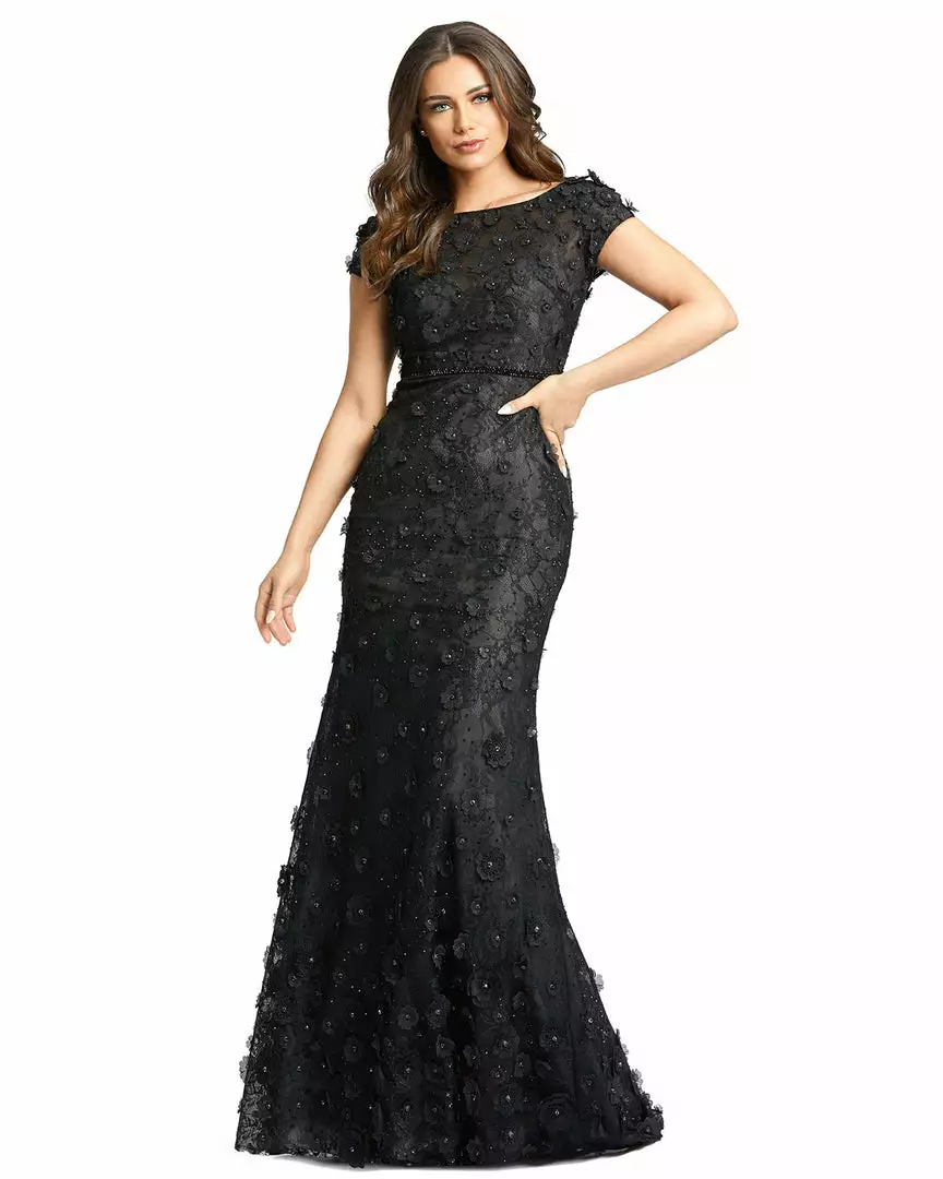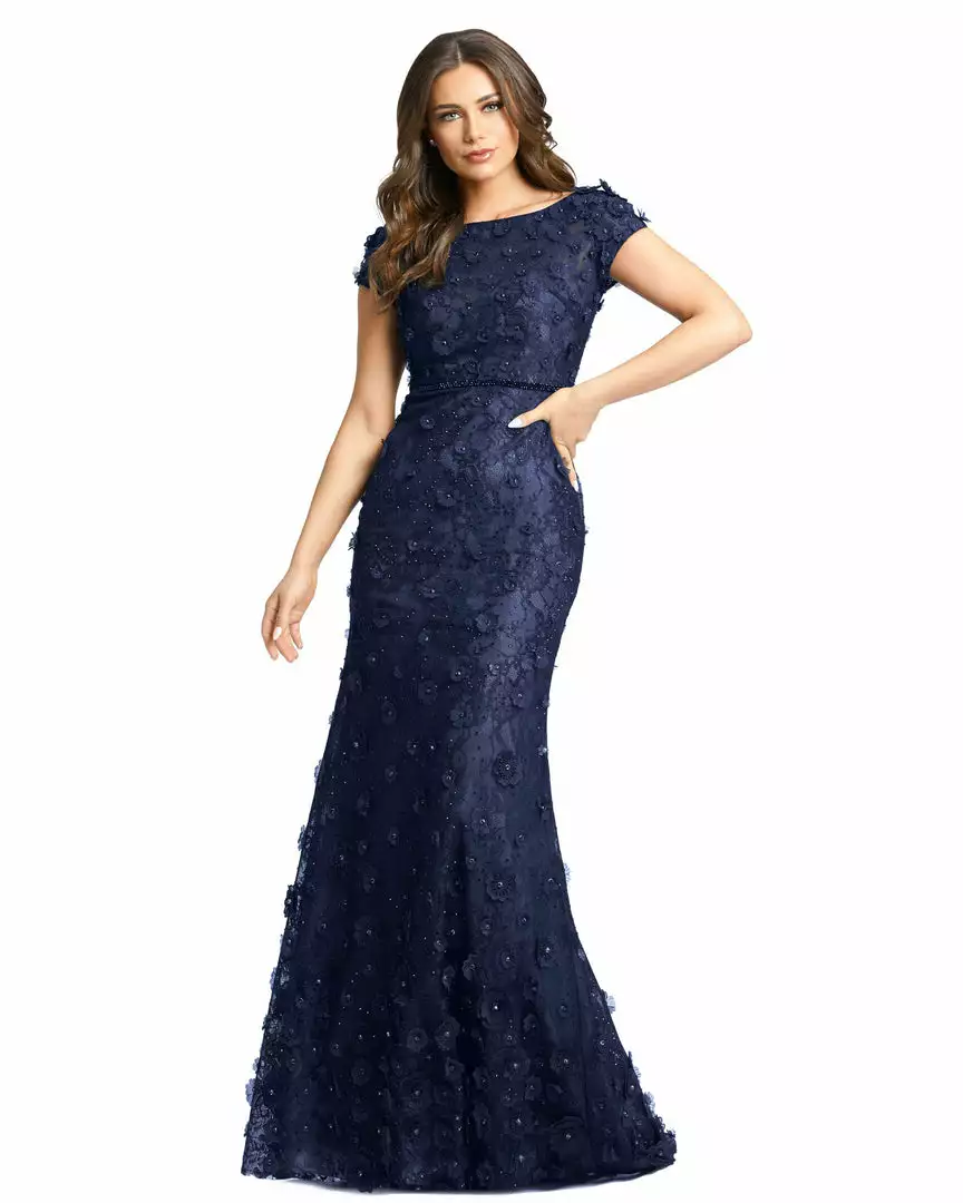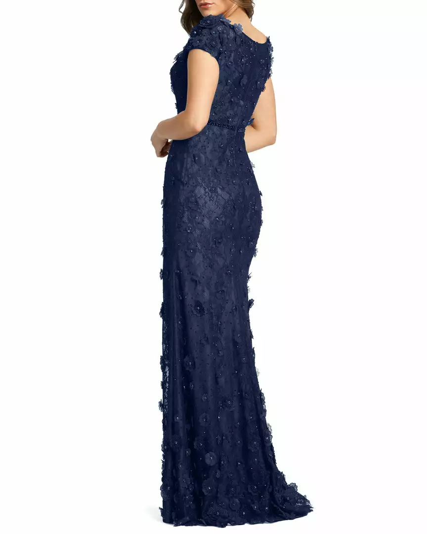 Elegant cap sleeve boat neck evening gown with an illusion neckline, floral applique and bead embellished lace overlay, and a hand-beaded belt at the natural waist.