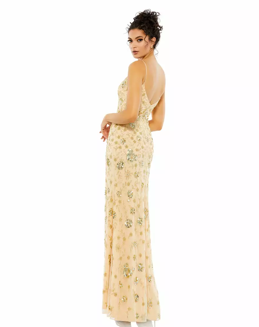 - Allover floral pattern composed of hand-stitched sequins and beading
