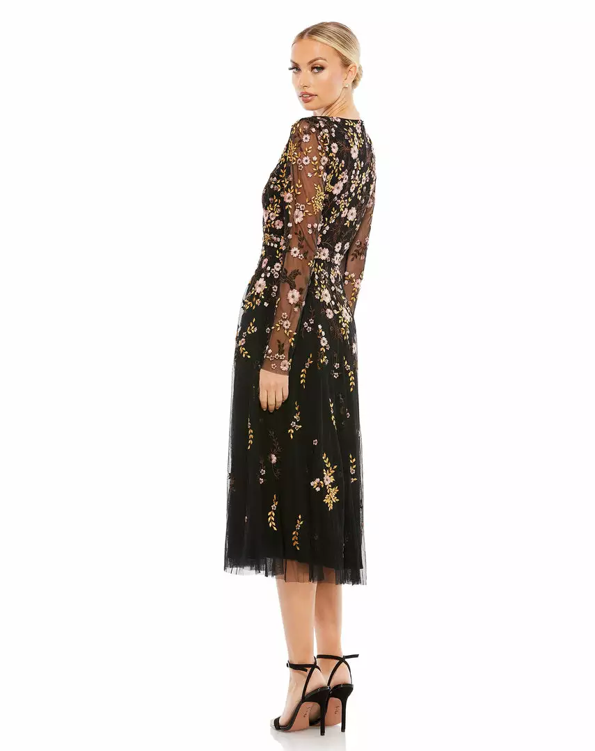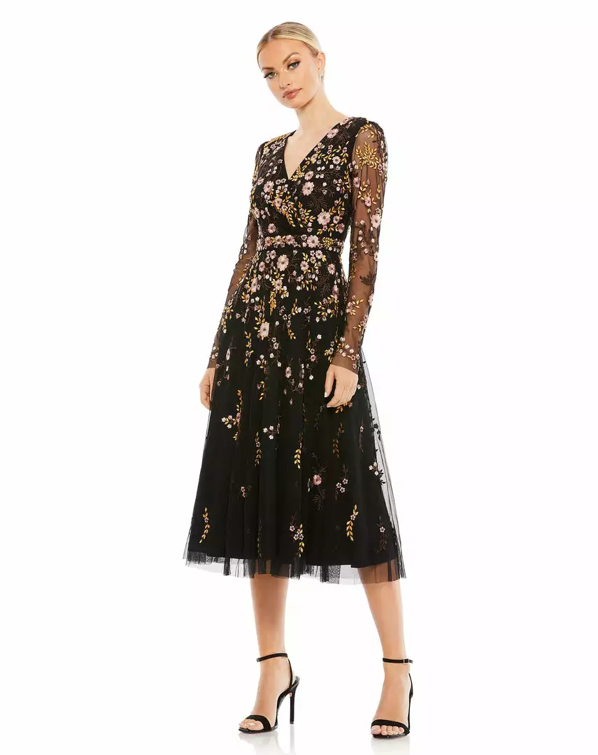 This ethereal cocktail dress is made from soft netting embroidered with pastel botanicals. The dress is styled with a surplice v-neckline, sheer long sleeves, and a subtle a-line skirt. Lightweight and fully lined through the body, this dreamy dress will be your go-to for any féte.
