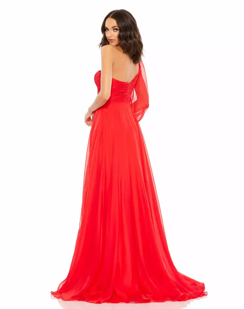 Flowy layered chiffon one shoulder gown with a single, semi-sheer blouson sleeve, an asymmetrical neckline, a ruched bodice, and a thigh-high slit.