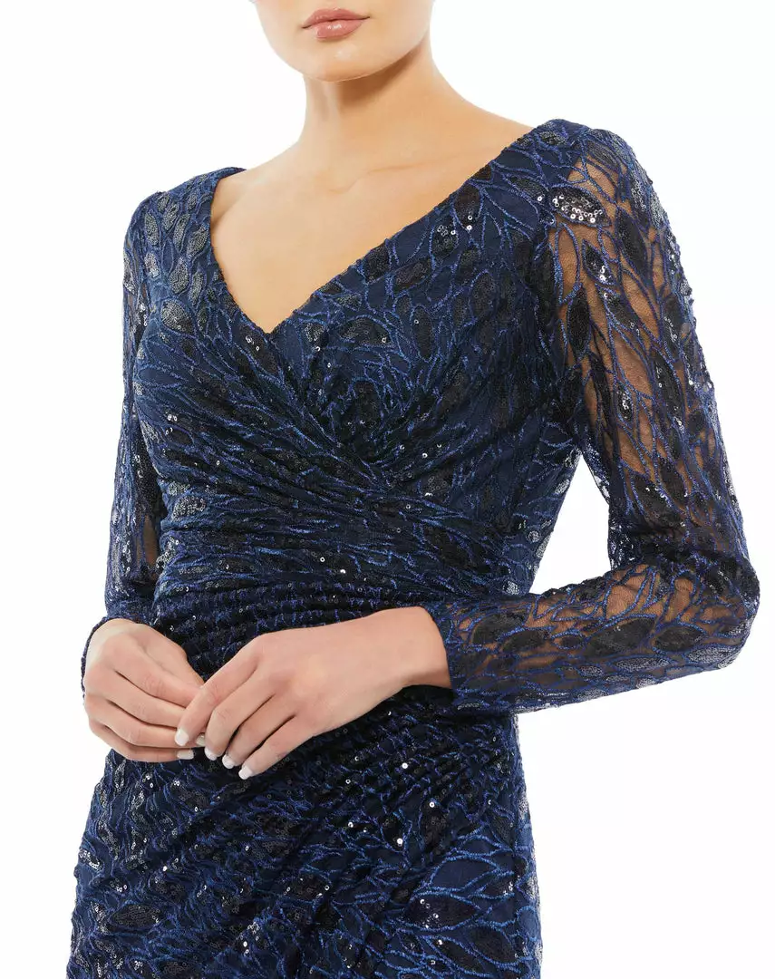 Sequined lace long-sleeve evening gown with flattering ruching at the waist and a thigh-high slit.