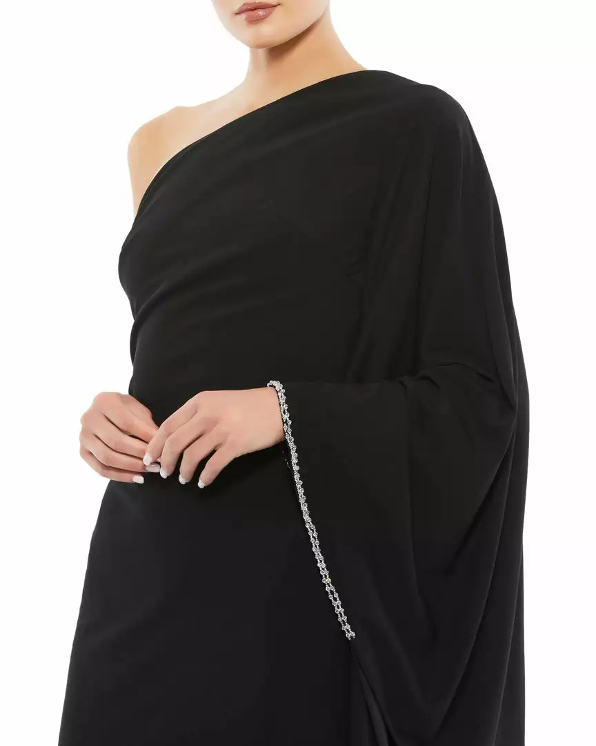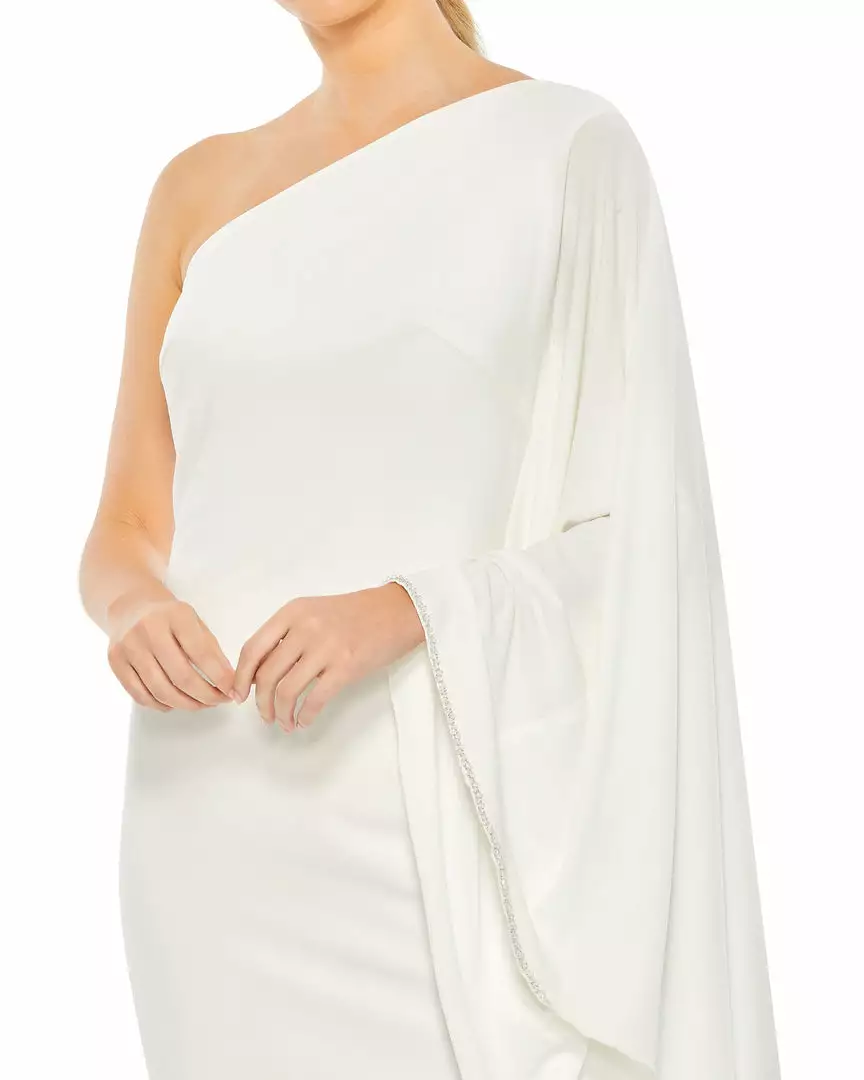 - Fitted through bodice and hips with a single dramatic cape sleeve