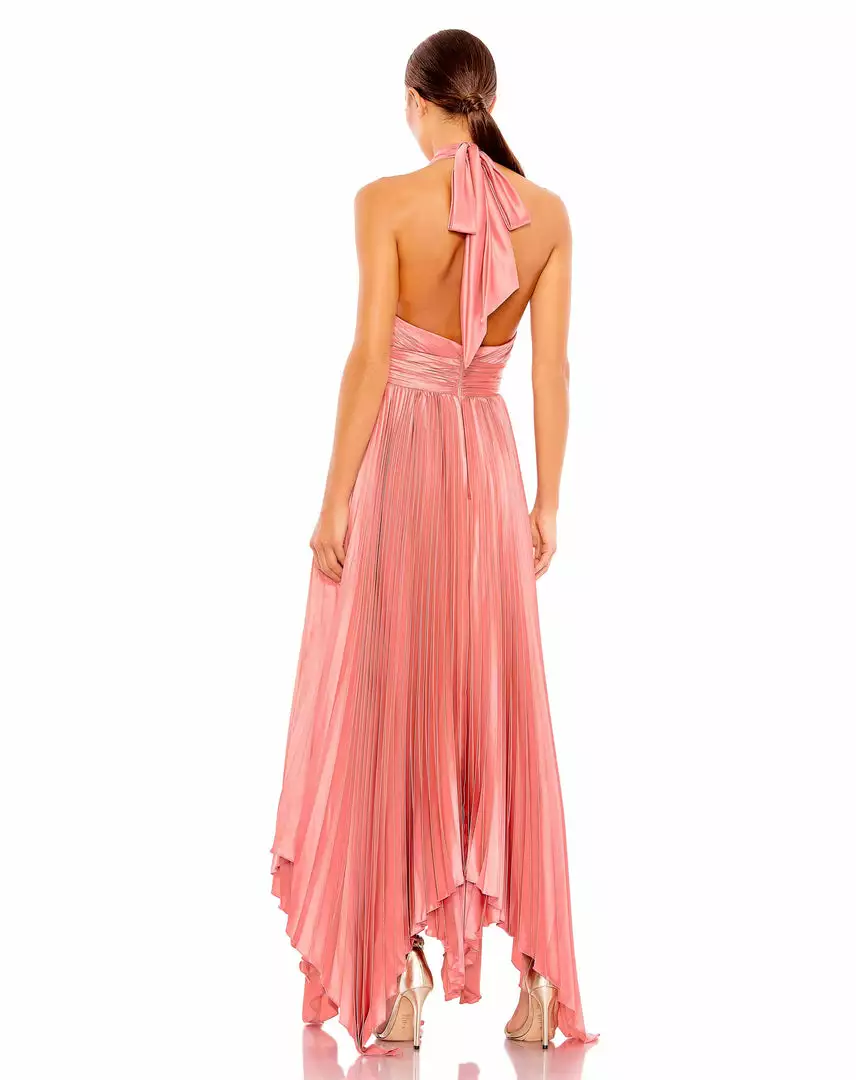 Wow at any event in this texture-rich dress certain to turn heads. Cut from glossy satin pressed with accordion pleats, this gown has a crisscross front with a halter neck and cutout, a cummerbund waist, and a layered handkerchief hem. The dress finishes with a silky tie bow at the nape.