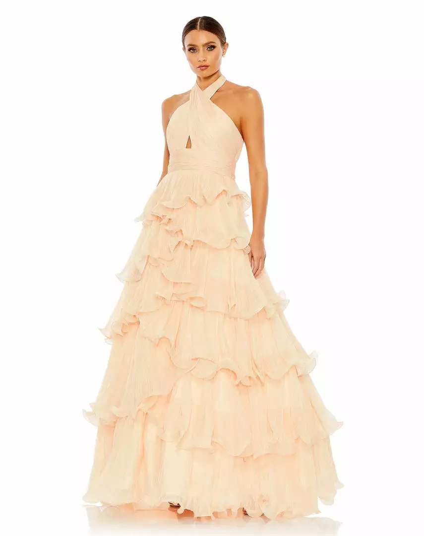 Pretty and playful, this prom gown is a joy to wear, styled with allover pleats and sculptural ruffled tiers. The gown is designed with a contemporary crisscross halter, a cinched cummerbund-inspired waistband, and a voluminous skirt.