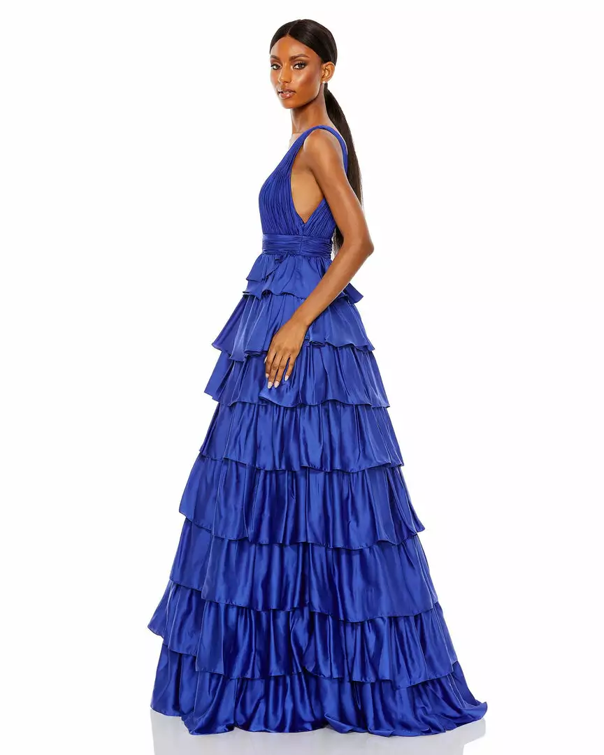 Designed in the season’s most popular silhouette, the satin gown pairs a plissé, plunge-cut bodice with a pleated cummerbund and decadent tiered skirt. Best of all, it looks as good in pictures as it does in person.
