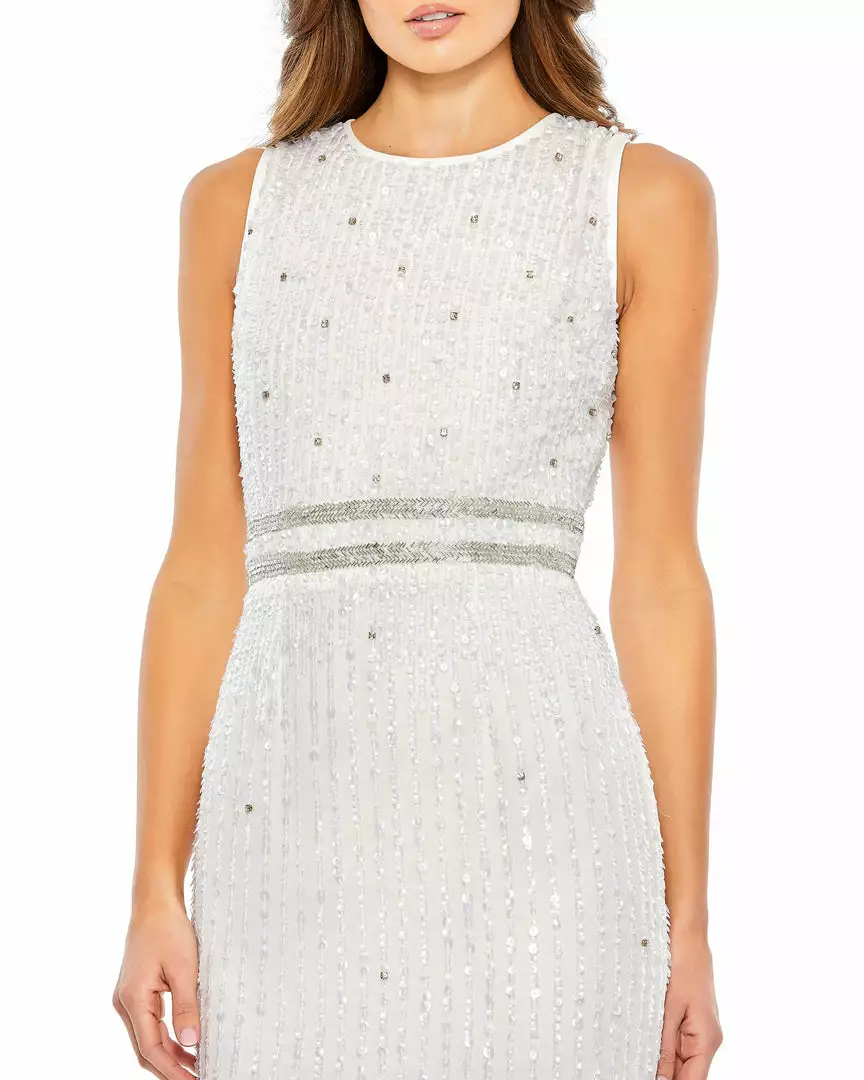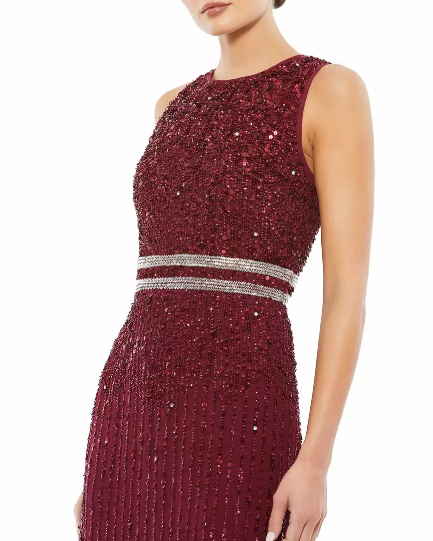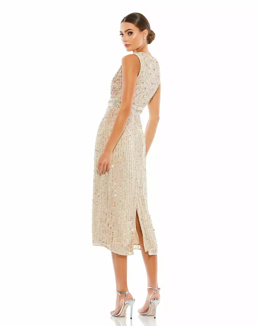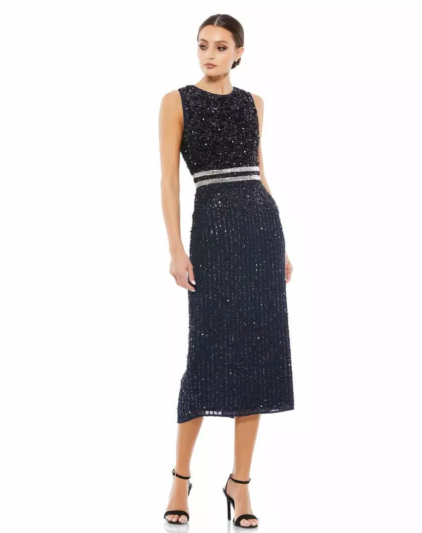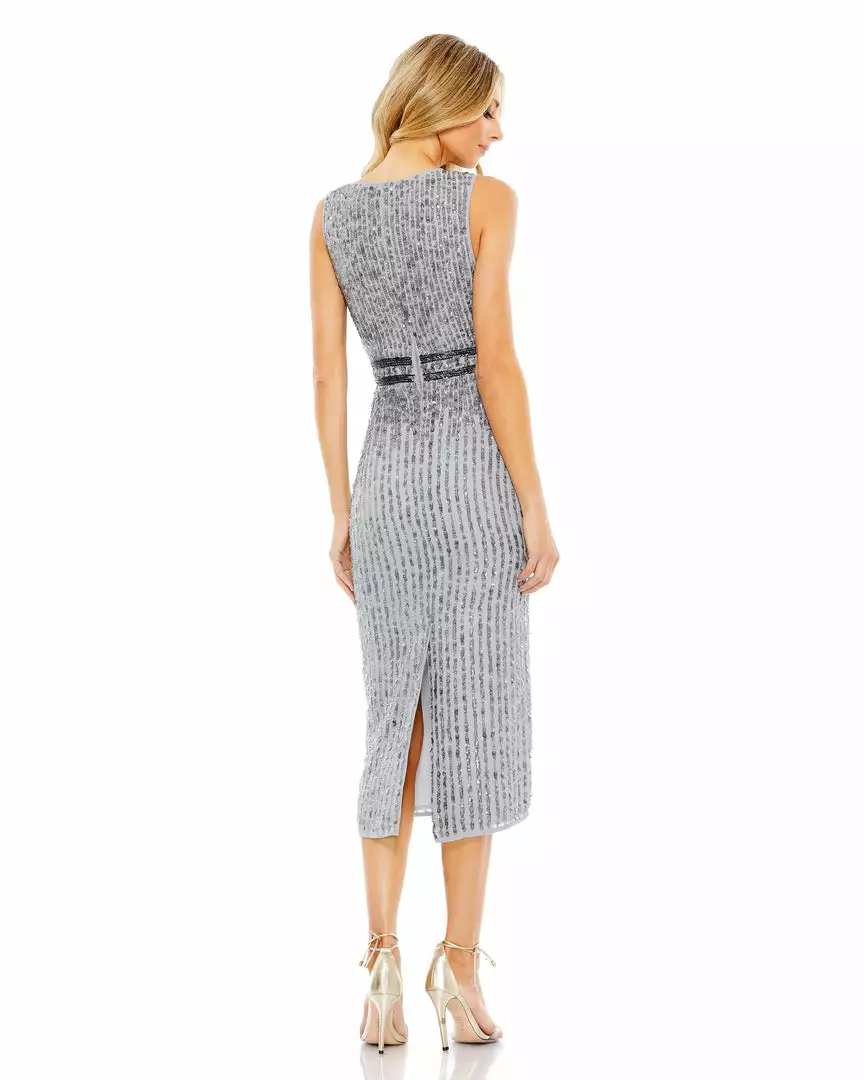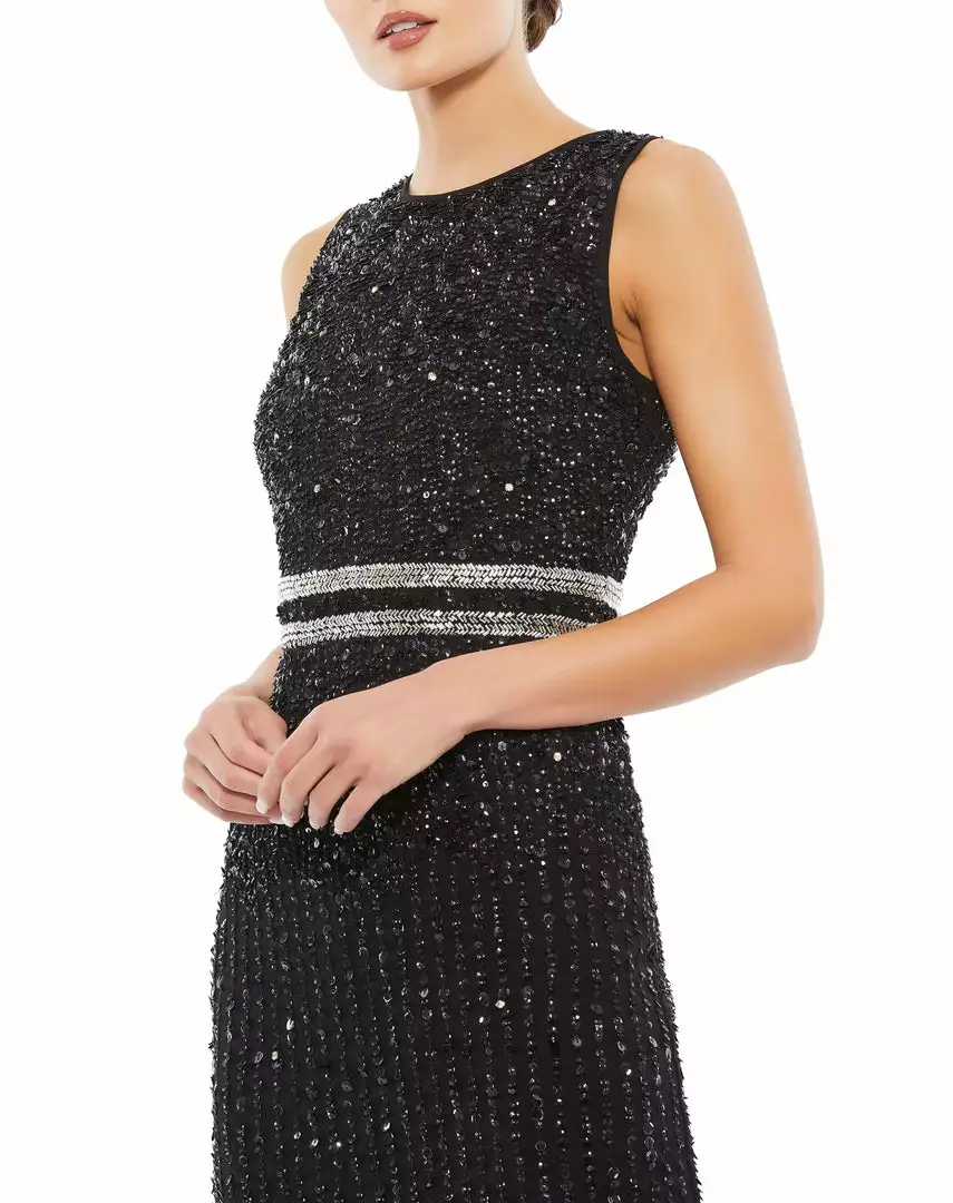 Elegant vertical-sequined sleeveless midi sheath dress with a flattering hand- beaded waist and back vent slit.