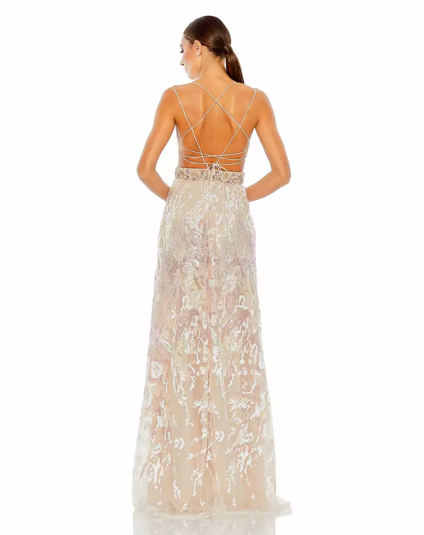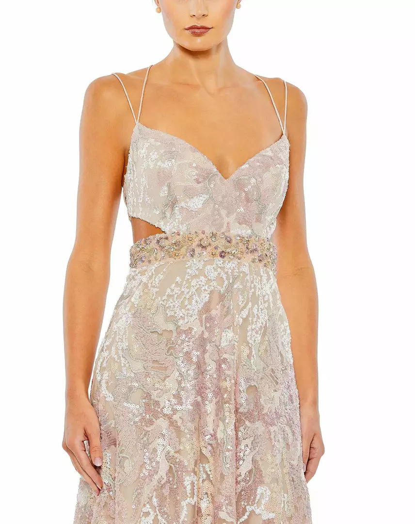 An artful array of miniature sequins and abstract embroidery make this gown one of the most unique in our collection. You’ll love every inch of it—from the floss-thin double straps to the decadent waist embellishment to the A-line skirt that offers just the right amount of pouf. An intricate tie back is a pretty way to punctuate the piece.