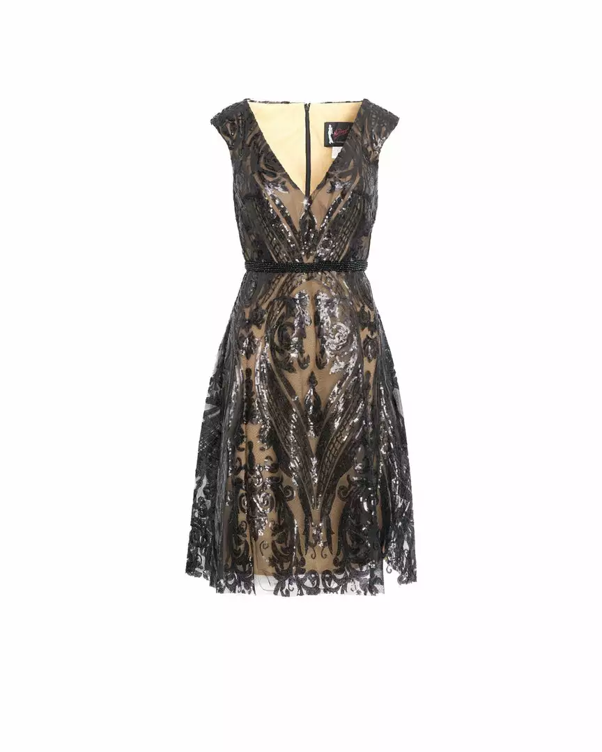 This elegant cocktail dress features cap sleeves, a low v-neckline, fitted bodice, and a tea-length A-line skirt. This dual-layer dress has a nude lining with a black damask-pattern overlay which is embellished with sequins for extra sparkle. A hand-beaded belt defines the natural waist.