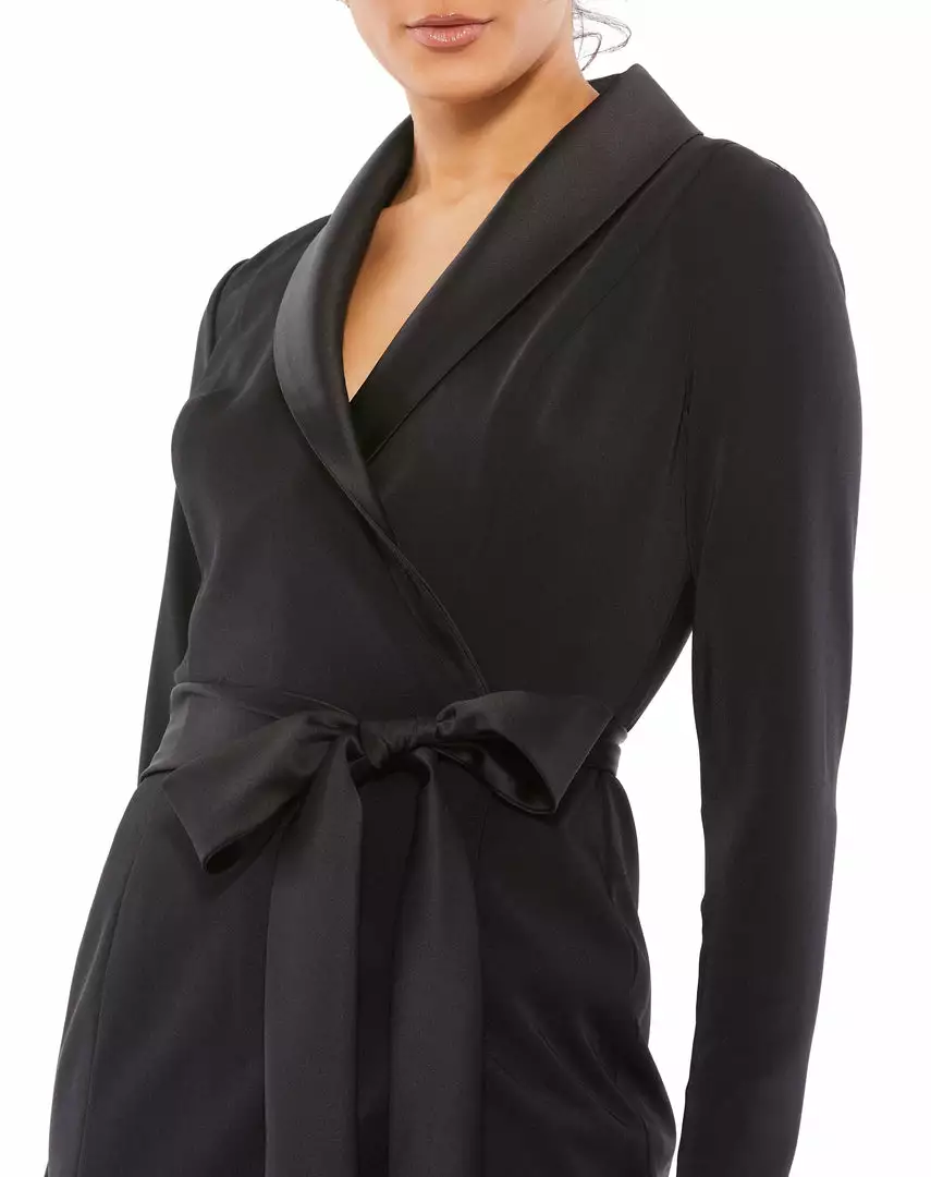 We’re in love with this tuxedo-inspired wrap dress that’s perfect for parties, holidays, and girls’ night out. The dress is cut well above the knee to showcase your gams and is styled with a satin shawl lapel and bow belt. Wear yours with glittery tights or bare legs and ankle-strap sandals.