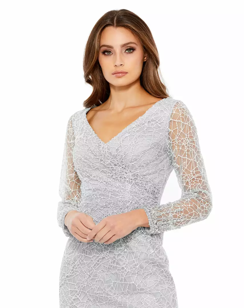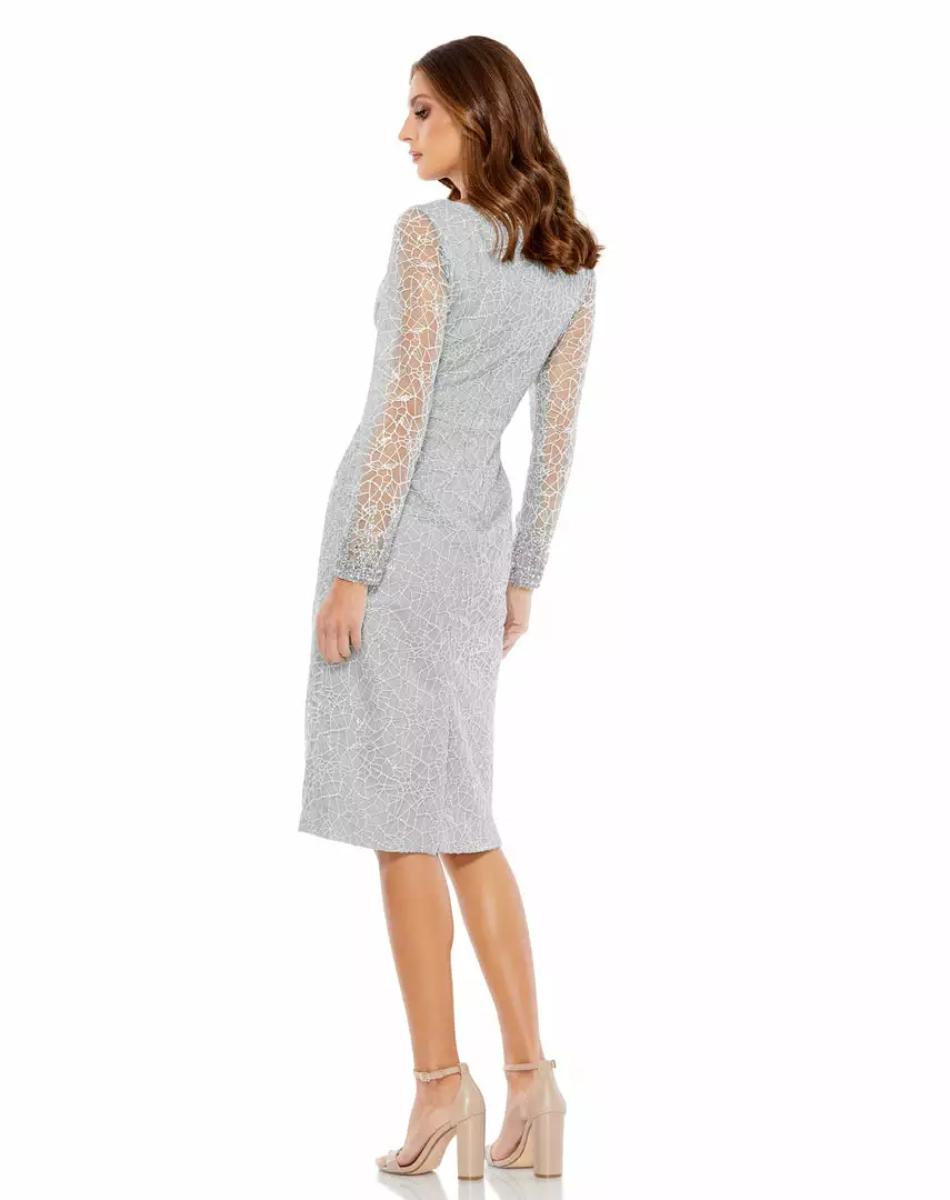 Chic midi dress with a wide v-neckline, sheer illusion sleeves, and jewel-accented cuffs