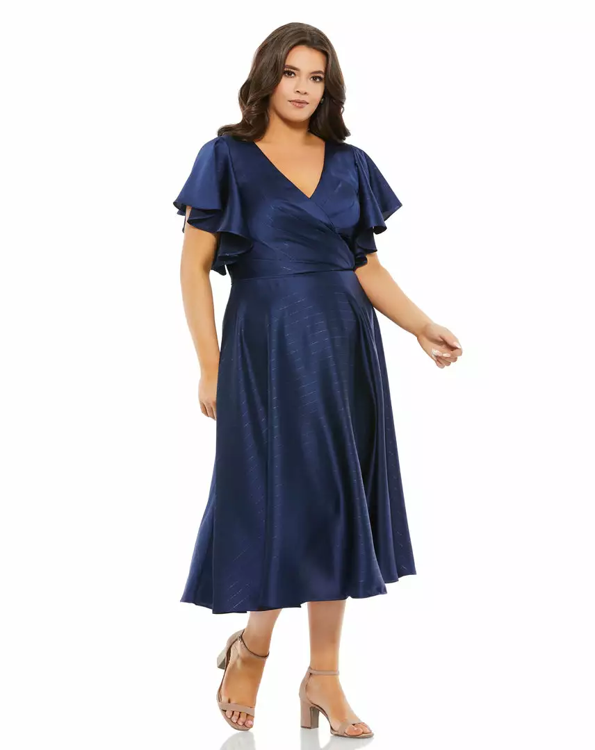 Mac Duggal Short Dresses Faux Wrap Butterfly Sleeve Flowy Midi Dress (Plus)