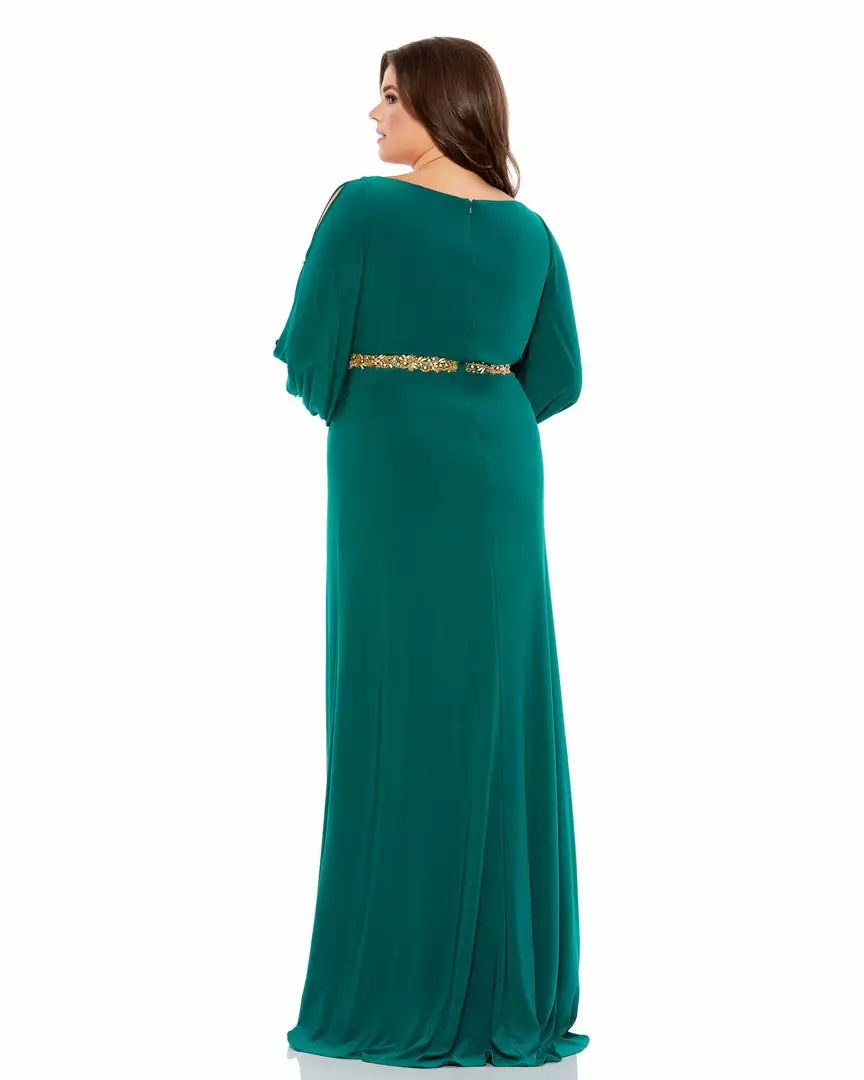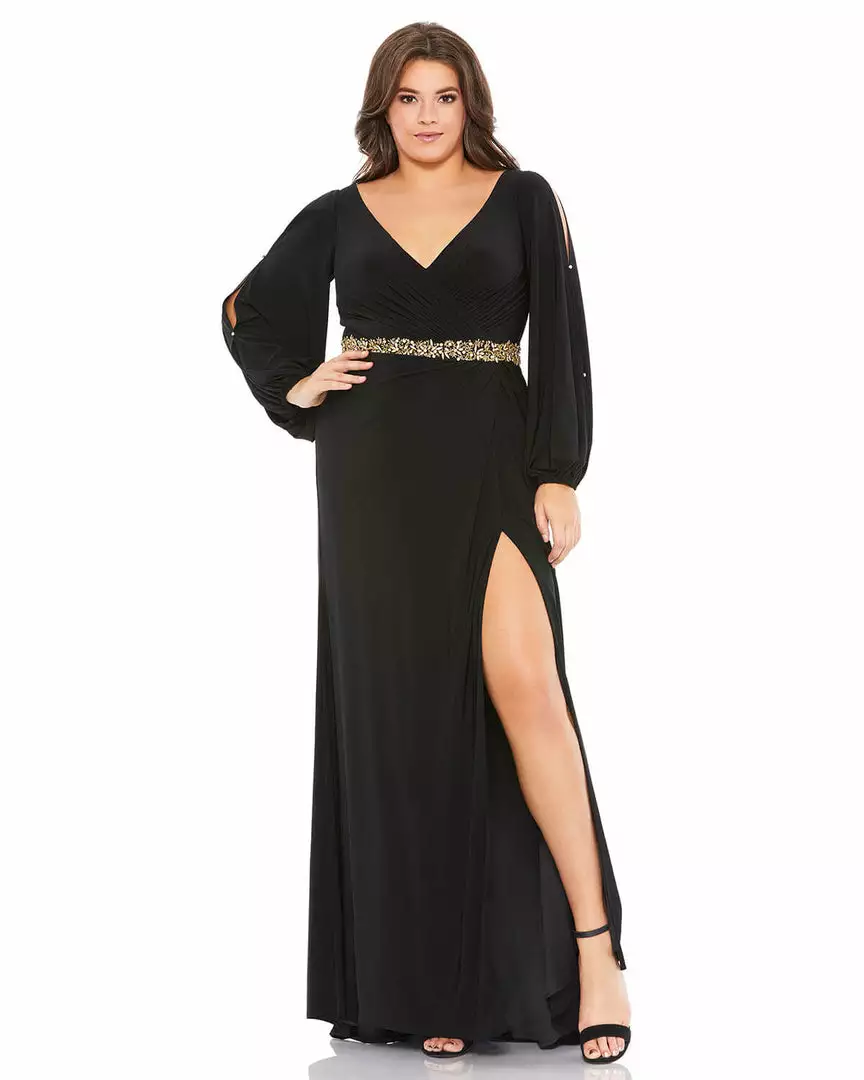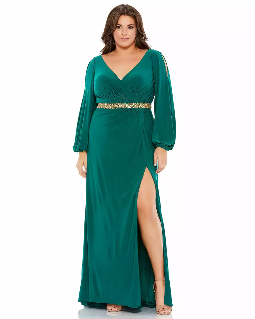 Elegant floor-length gown with a faux-wrap v-neckline, gathered waist, long split sleeves, and a thigh-high slit. A hand-embellished belt defines the natural waist.