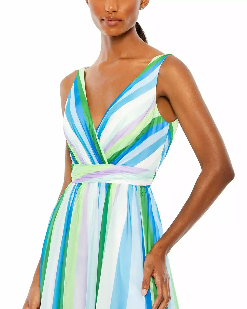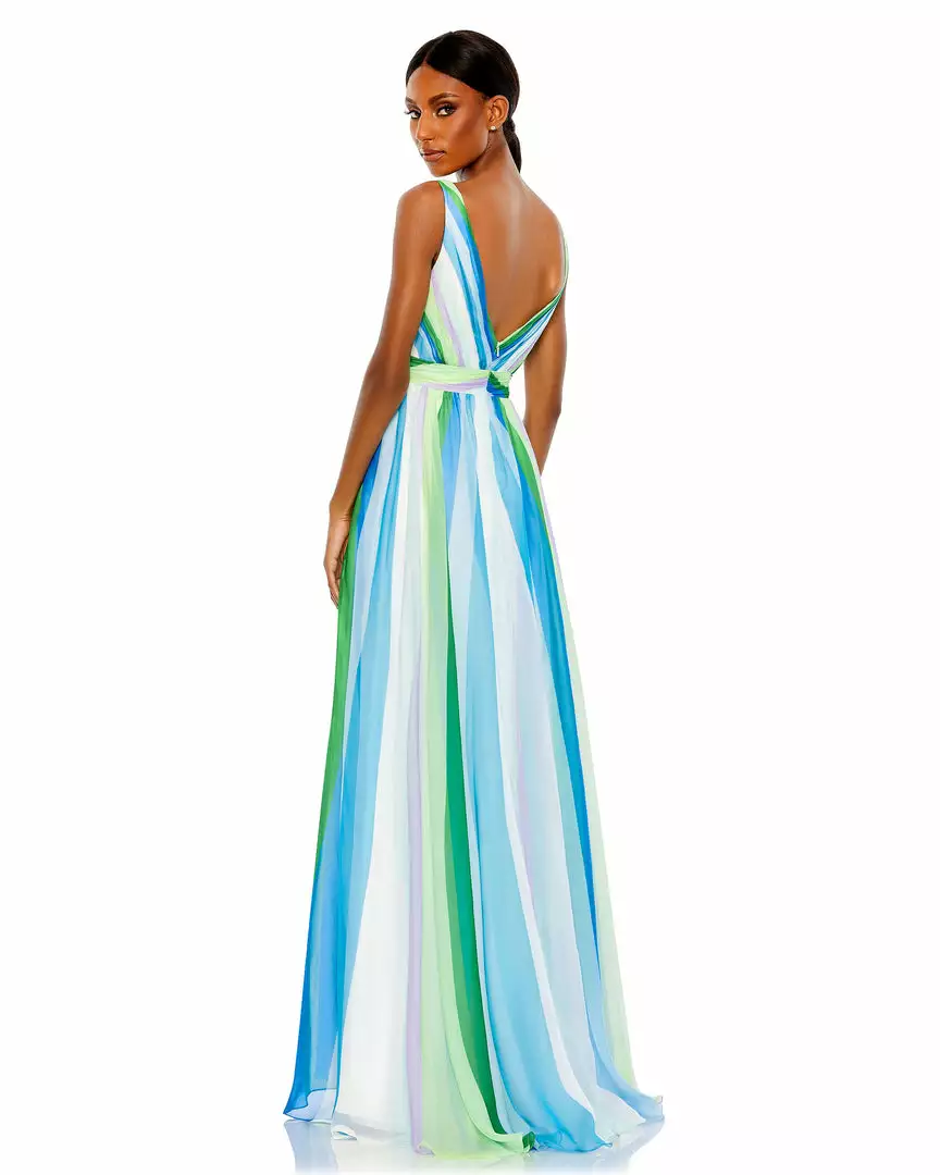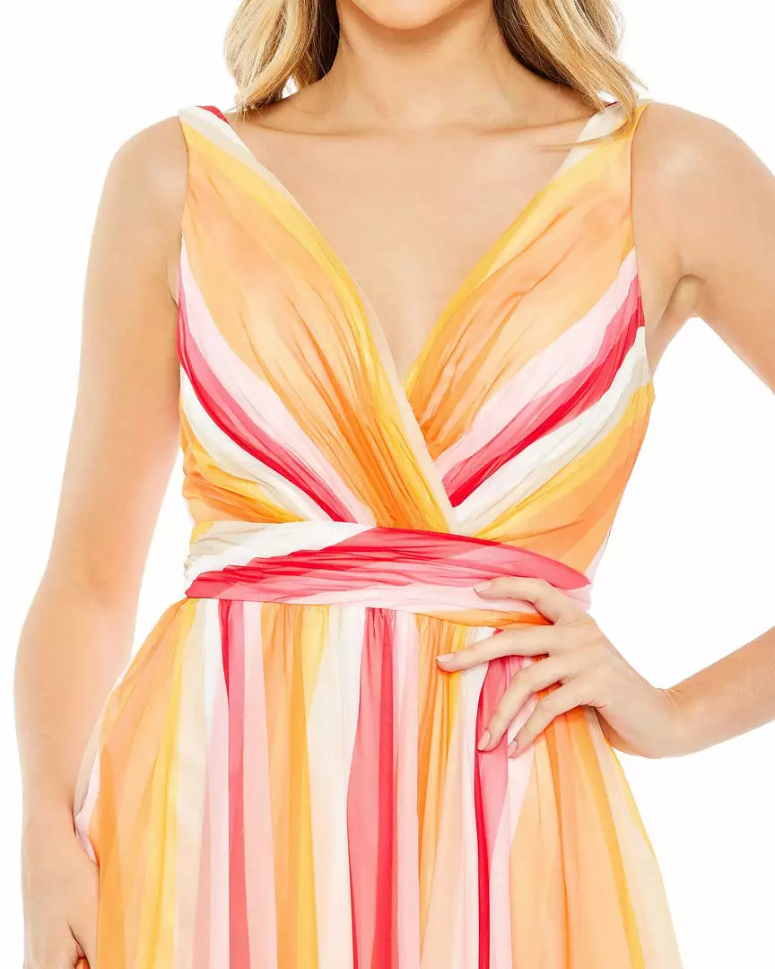 Perfect for prom, a summer wedding, or a formal soirée, this gown is crafted from chiffon punched up with sunrise-shaded streaks. Comfortable and effortless, the gown offers easy elegance with a surplice neckline, set-on waistband, and flowy A-line skirt finished with an off-center slit.