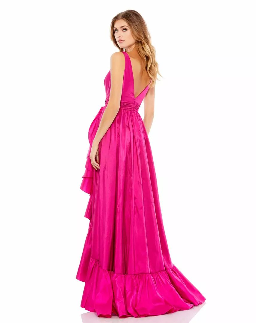Striking hi-low taffeta gown with a pleated bodice, plunging v-neckline, and a dramatic ruffled hemline.