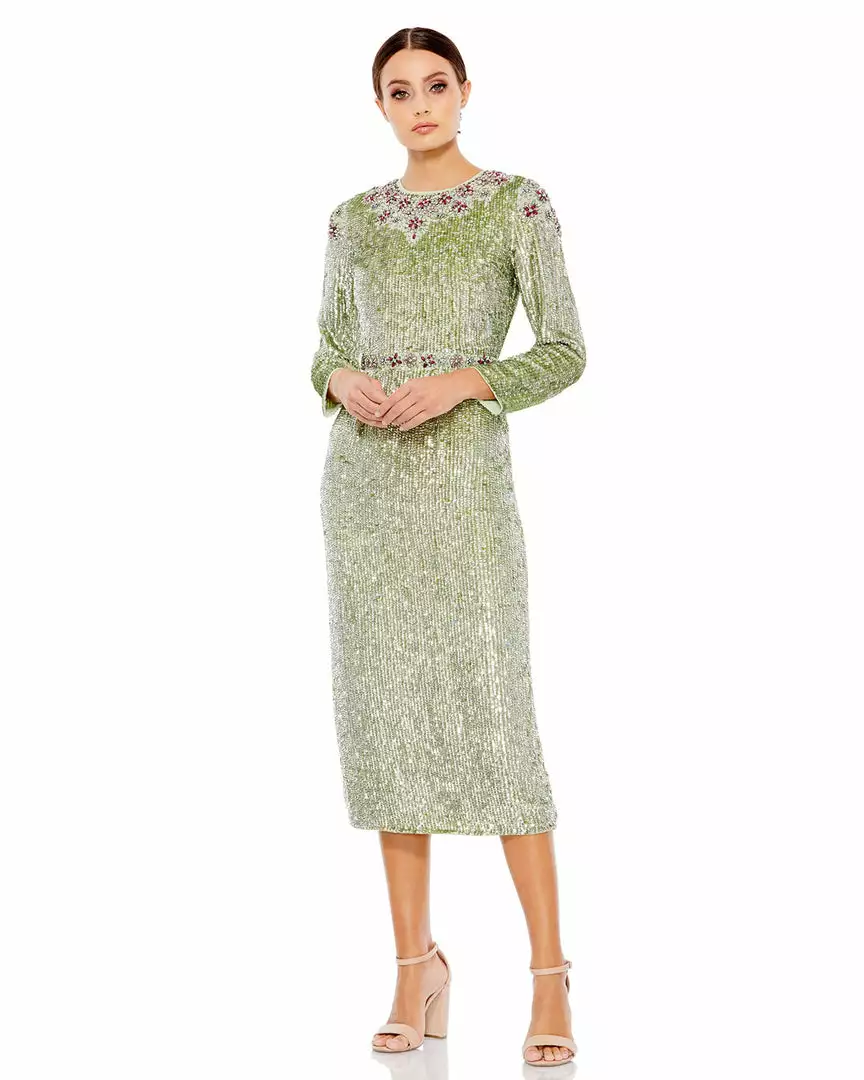 If a diamond necklace is your coveted accessory, then this decadent style is your wish list dress. The sensational dress is cut in a modest midi sheath completely covered in sequins that add texture and shine. Bloom-arranged jewels glitter at the collar, shoulders, and waist in a belt-like accent.