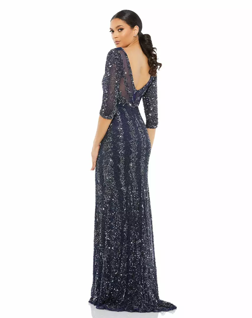 Nothing can outshine you in a gown with hand-applied sequins and beads shimmering like the night sky. This slimming gown is designed with semi-sheer three-quarter-length sleeves, a décolletage-baring neckline, and a sensual V-cut back. Alternating clusters of round sequins and dash-shaped beads create an organic stripe-like pattern across the glamorous gown.