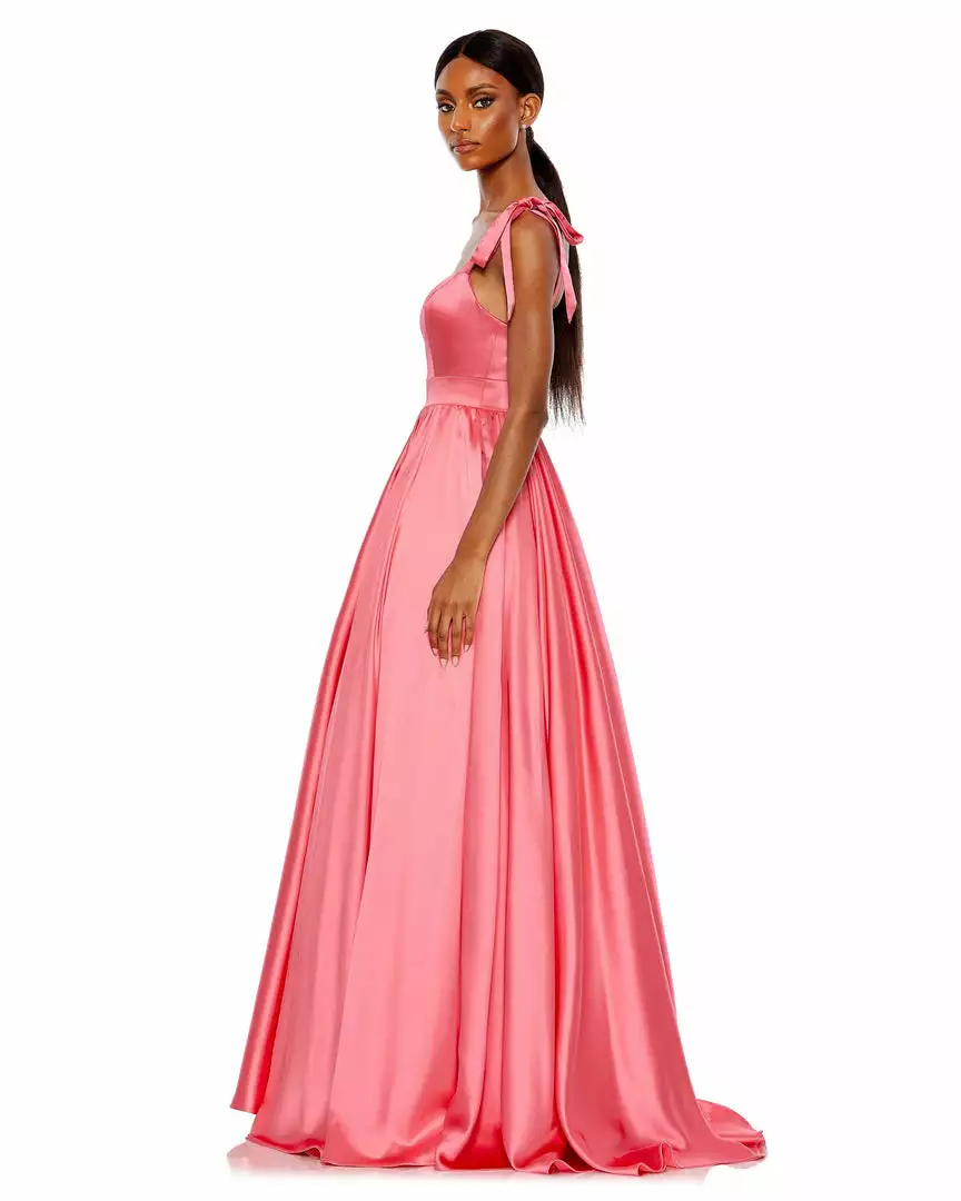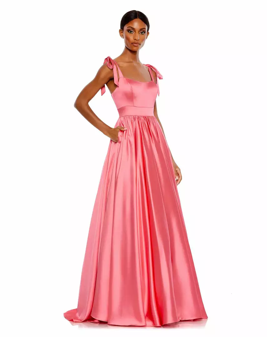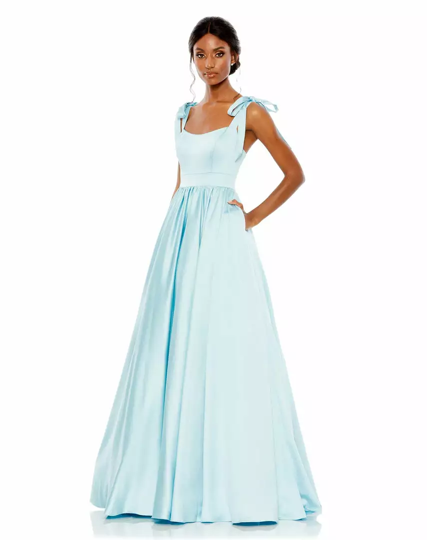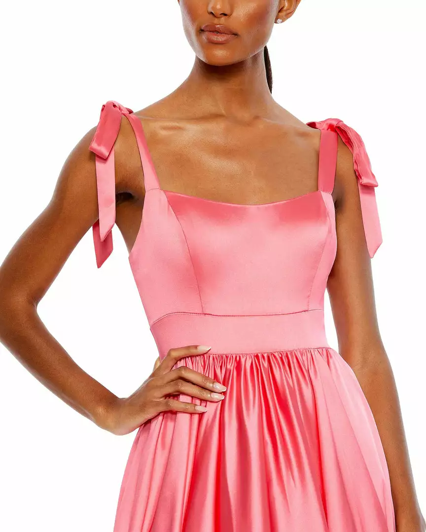 Winsome and effortlessly chic. This formal A-line dress features tie shoulders, a set-on waistband, and a gathered skirt with deep hand pockets.