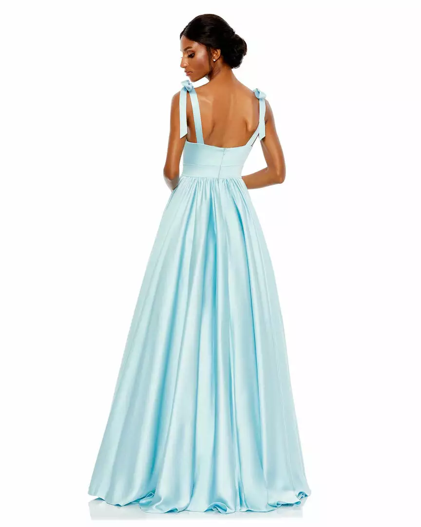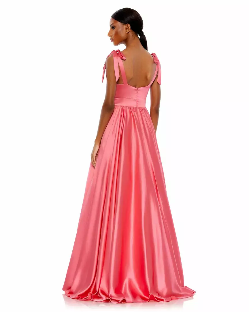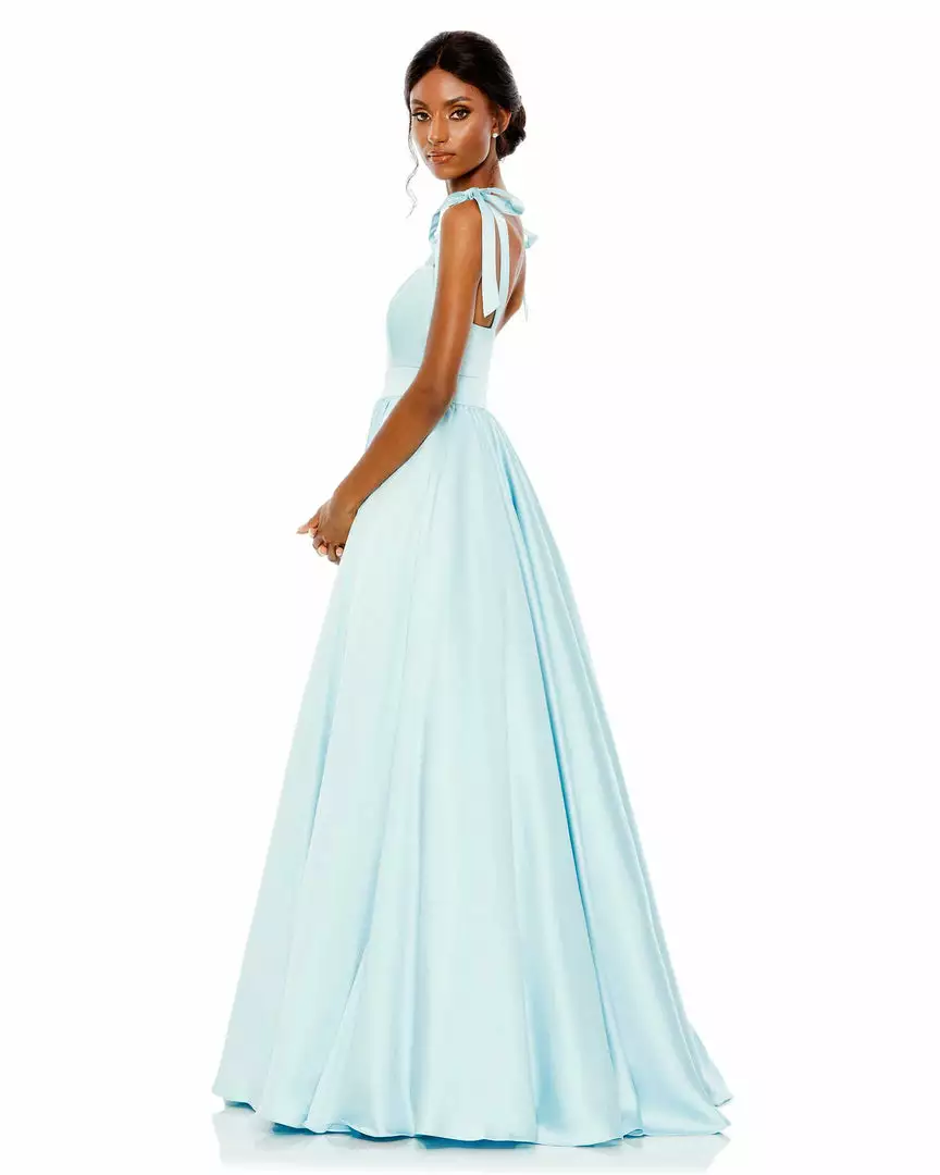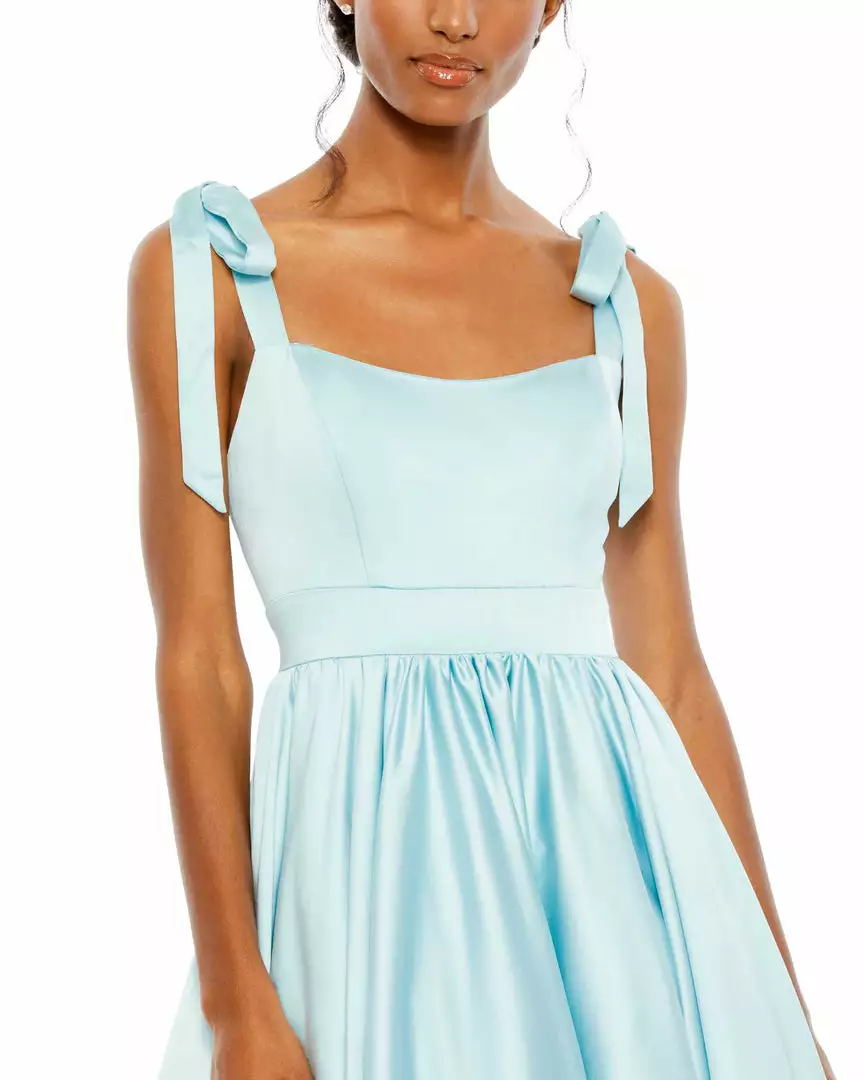Winsome and effortlessly chic. This formal A-line dress features tie shoulders, a set-on waistband, and a gathered skirt with deep hand pockets.