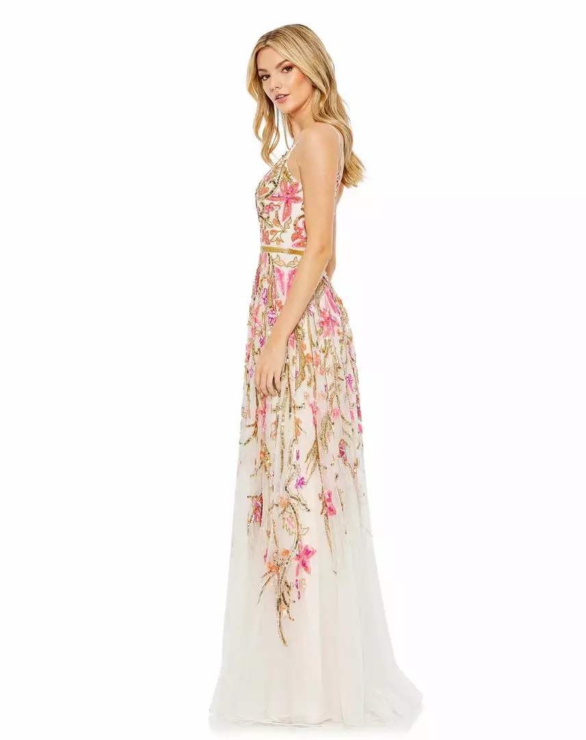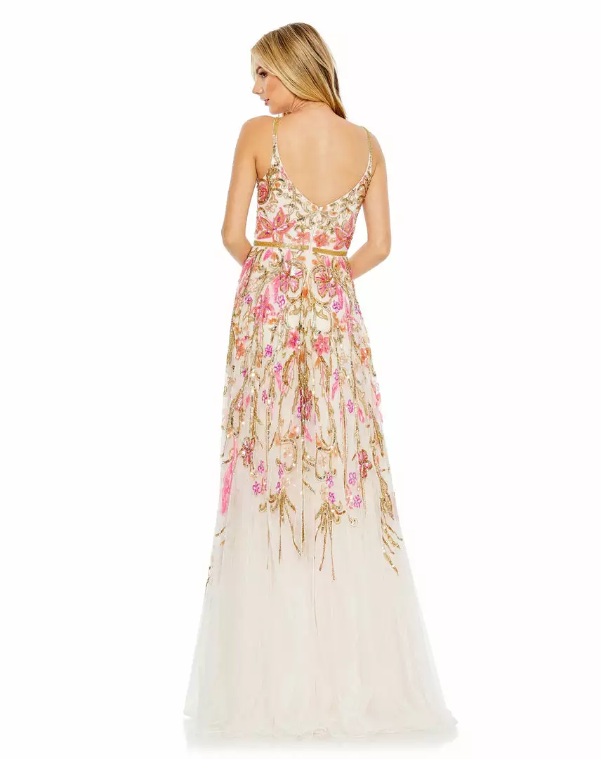 Mac Duggal V Neck Floral Embellished Spaghetti Strap Gown