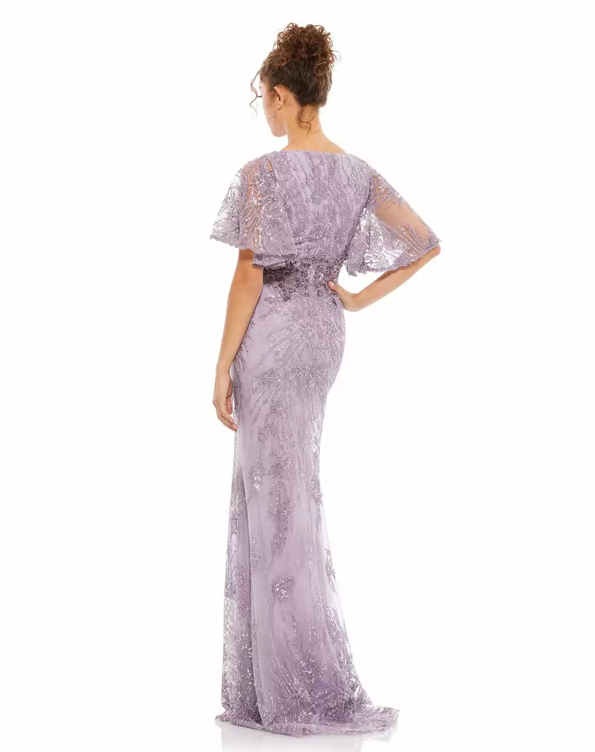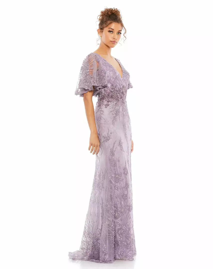 Delicately embellished evening gown covered in shimmering beadwork finished with a short train and butterfly sleeves.