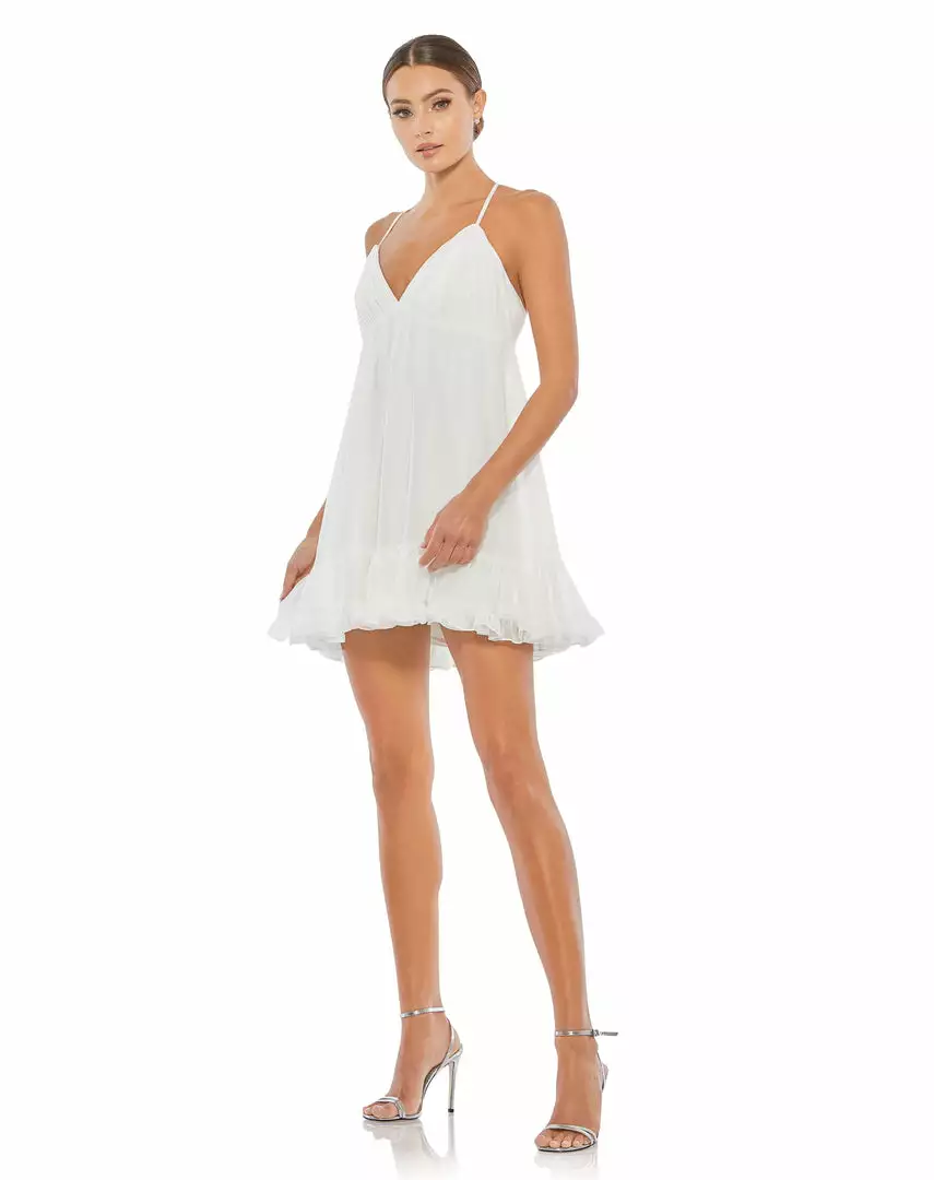 Spaghetti strap chiffon babydoll dress with a v-neckline, criss-cross back, and a flirty ruffled hem.